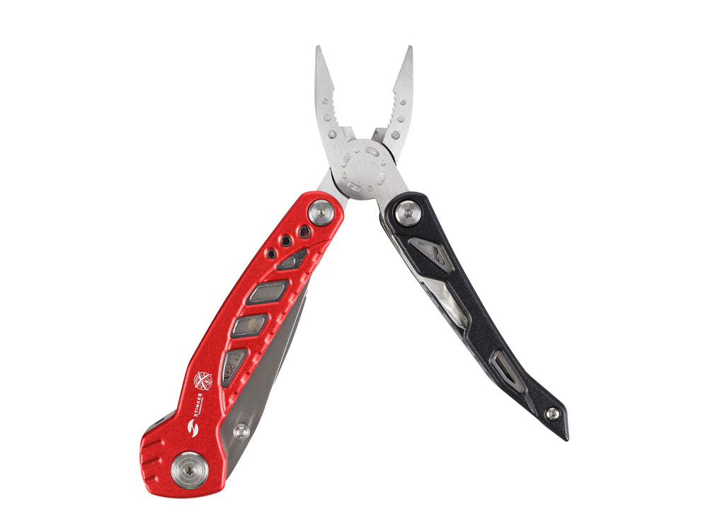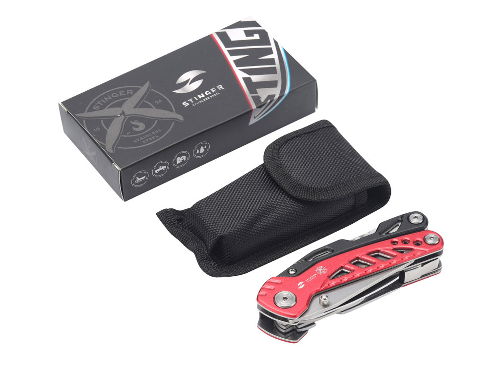 Мультитул Stinger, 105x30 мм, 11 функций, сталь/алюминий, красно-чёрный, в нейлоновом чехле купить оптом и в розницу с нанесением логотипа в Санкт-Петербурге