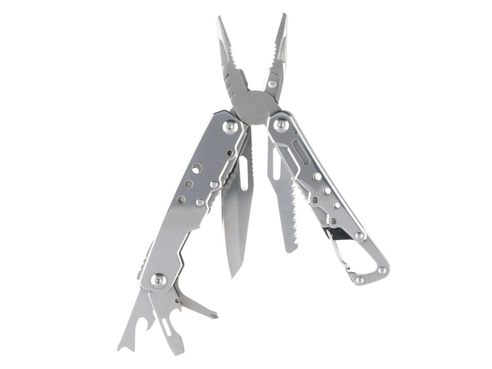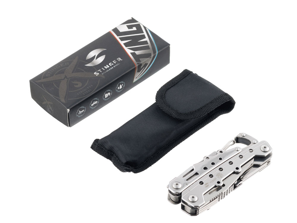 МНОГОФУНКЦИОНАЛЬНЫЙ ИНСТРУМЕНТ STINGER С НАБОРОМ ИЗ 12 ФУНКЦИЙ: 1. Острогубцы 2. Пассатижи 3. Кусачки 4. Лезвие большое плоское 5. Пила по дереву 6. Отвёртка крестовая 7. Отвёртка шлицевая большая 8. Инструмент для снятия изоляции 9. Стропорез 10. Открывалка для бутылок 11. Консервный нож 12. Карабин ХАРАКТЕРИСТИКИ: Материал инструментов: нержавеющая сталь 3Cr13 Материал рукояти: нержавеющая сталь Длина: 105 мм Ширина: 40 мм Вес: 261 г В комплекте: чехол из синтетического материала Упаковка: картонная коробка