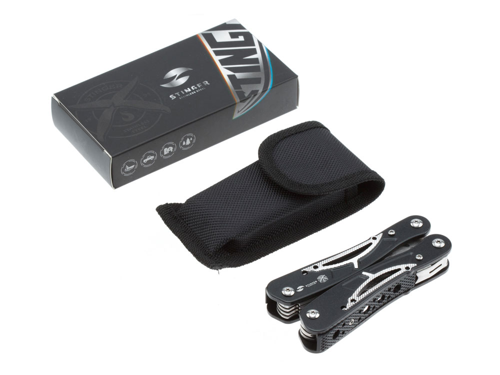 Мультитул Stinger, 105x45 мм, 13 функций, сталь/алюминий, серебристо-чёрный, в нейлоновом чехле купить оптом и в розницу с нанесением логотипа в Санкт-Петербурге