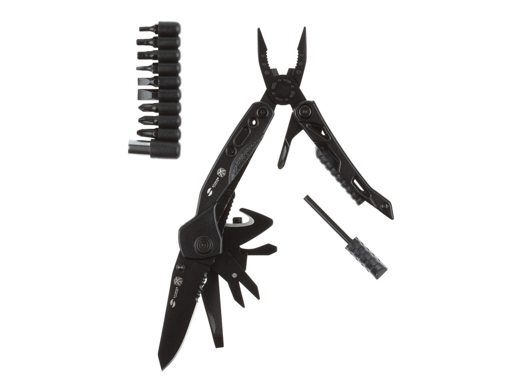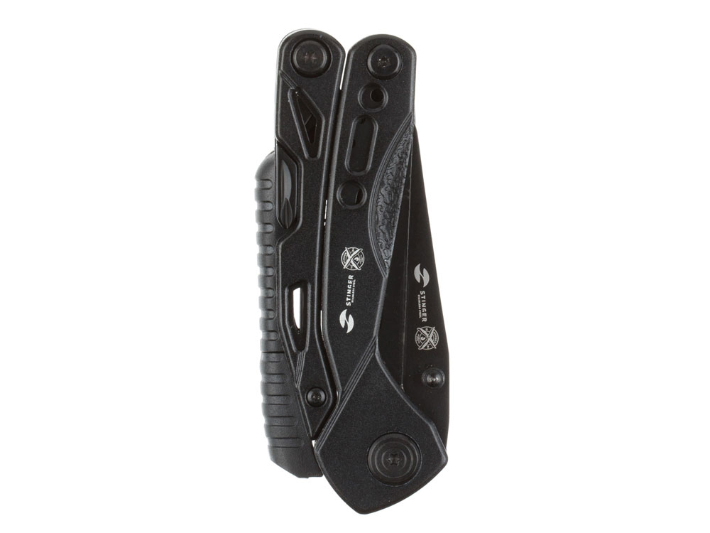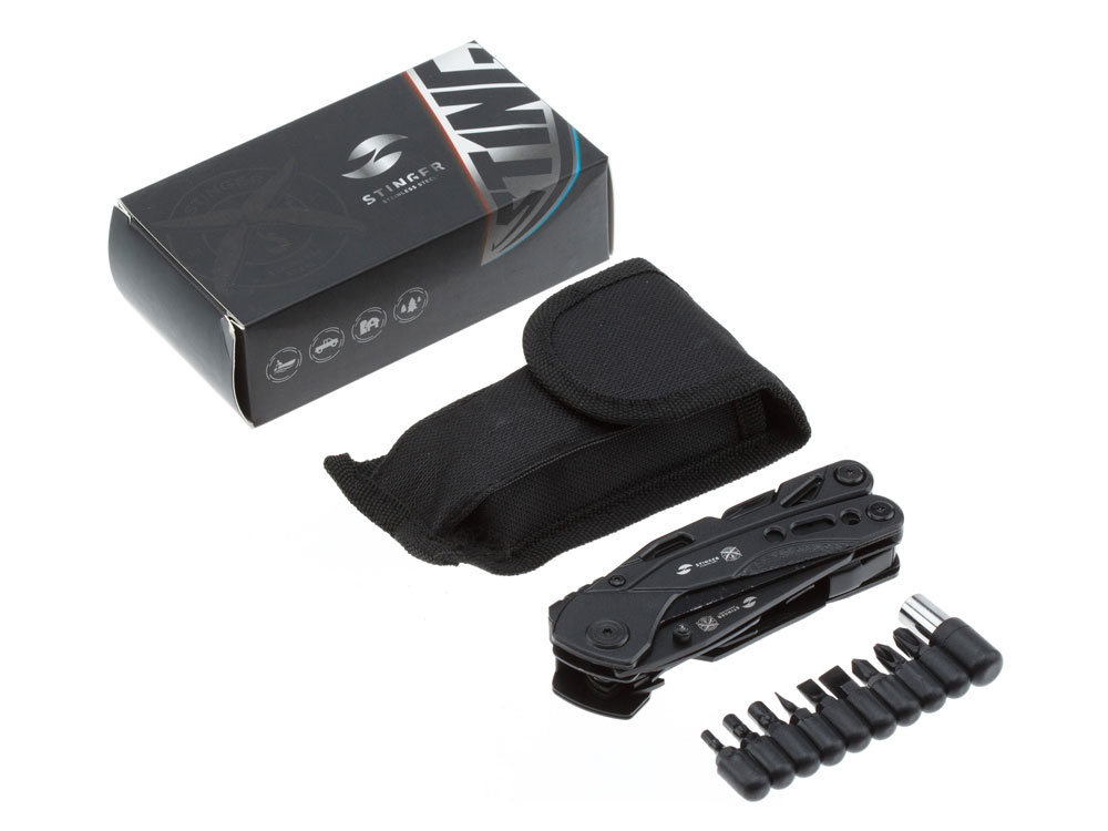 МНОГОФУНКЦИОНАЛЬНЫЙ ИНСТРУМЕНТ STINGER С НАБОРОМ ИЗ 13 ФУНКЦИЙ: 1. Острогубцы 2. Пассатижи 3. Кусачки 4. Фиксирующееся большое лезвие с частично серрейторной кромкой 5. Отвёртка крестовая 6. Отвёртка шлицевая большая 7. Отвёртка шлицевая малая 8. Открывалка для бутылок 9. Напильник 10. Ножницы 11. Стропорез 12. Набор из 9 бит с переходником 13. Огниво ХАРАКТЕРИСТИКИ: Материал инструментов: нержавеющая сталь 2Cr13 Материал рукояти: алюминий Длина: 107 мм Ширина: 37 мм Вес: 236 г В комплекте: чехол из синтетического материала Упаковка: складная картонная коробка