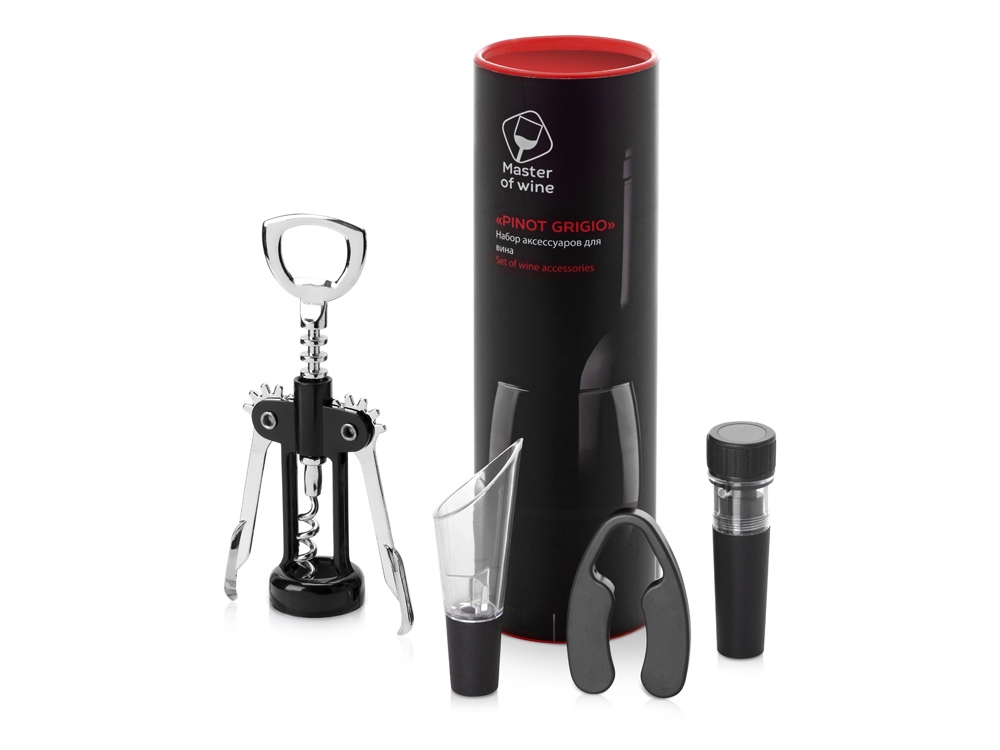 В винном наборе Pinot Grigio собрано все, что необходимо для откупоривания, подачи и длительного хранения вина. Аксессуары поставляются в эффектном красном тубусе и брендированном шубере. В состав комплекта входят: · механический штопор, который позволяет быстро откупорить бутылку и извлечь пробку без каких-либо повреждений; · вакуумная пробка, продлевающая срок хранения вина; · аэратор для переливания вина из бутылки в бокал и насыщения кислородом; · нож для срезания фольги. Набор аксессуаров станет функциональным и стильным подарком, который понравится ценителям благородных напитков.
