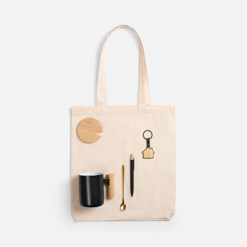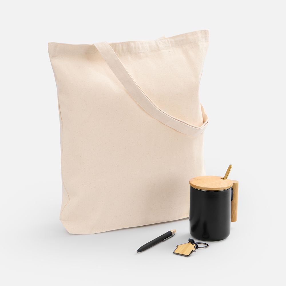 | Материал | кружка - керамика, крышка, ручка - бамбук; ложка - нержавеющая сталь; сумка - хлопок 100%, плотность 210 г/м²; саржа; брелок - бамбук, металл; ручка - металл, алюминий; кнопка - бамбук |