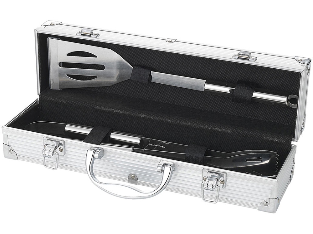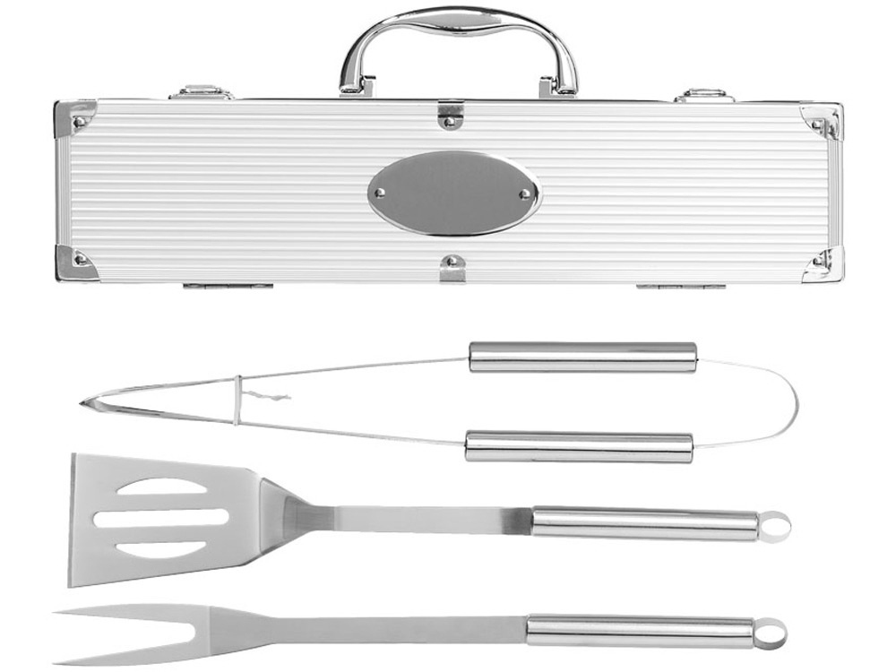 Набор для барбекю 3 предмета. Лопатка, щипцы и вилка в кейсе. На алюминиевом кейсе имеется шильд для персонализации.
