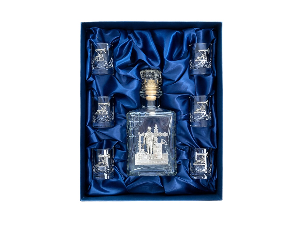 Подарочный набор со штофом Нефтяной. Традиционная для русского человека комплектация: элегантный графин емкостью 750 мл. с оловянным барельефом Нефтяник и 6 стопок емкостью 50 мл. с оловянным барельефом Нефтяная вышка. Материал барельефов: сплав с содержанием олова не менее 95%(пьютер). Художественное литье,чернение с эффектом антикварного серебра,полировка. Ручная работа. Подарочная упаковка люкс с атласным ложементом.