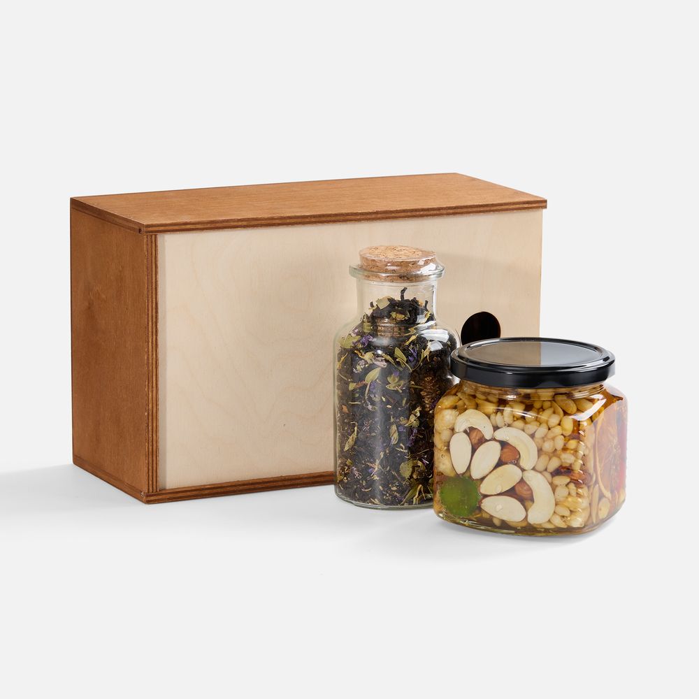 В наборе собраны дары сибирской природы: ароматный медовый десерт с хрустящими орехами, цукатами и семенами и травяной чай «Сила Сибири». В основе чая — крепкий черный чай с лесными травами, ягодами и хвойными нотами, создающими гармоничный вкус со сладковатым послевкусием. Все упаковано в аккуратный деревянный ящик — такой набор станет практичным подарком или приятным дополнением к вечернему чаепитию для тех, кто любит натуральные вкусы и атмосферу уюта.