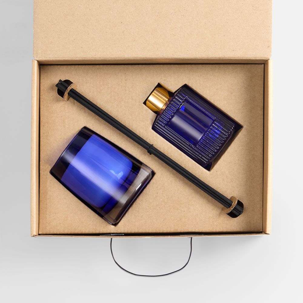 | Материал | флакон, подсвечник - стекло, палочки из файбера; свеча - воск; коробка - микрогофрокартон |