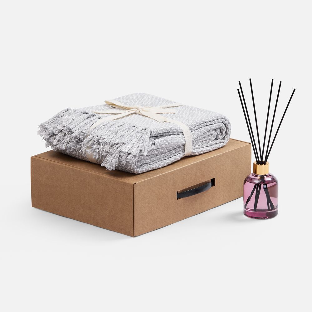 | Материал | плед - хлопок 80%, полиэстер 20%, плотность 260 г/м²; флакон - стекло, палочки из файбера; коробка - микрогофрокартон |