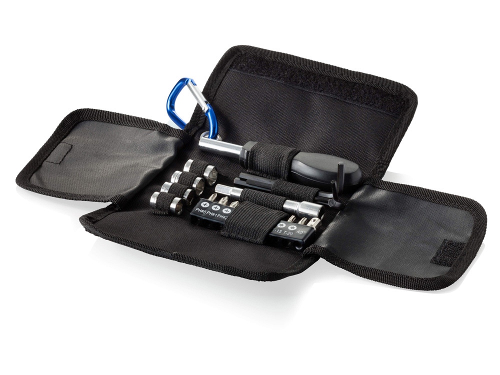 Набор из 19 инструментов. Небольшой складной набор из 19 инструментов с карабином для удобного хранения. Набор включает: 4 головки (7-8-9-10 мм), 1 отвертку для головок, 10 насадок для отвертки, 1 удлинитель и 3 шестигранных ключа (3-4-5 мм). 600D и чехол из ПУ.