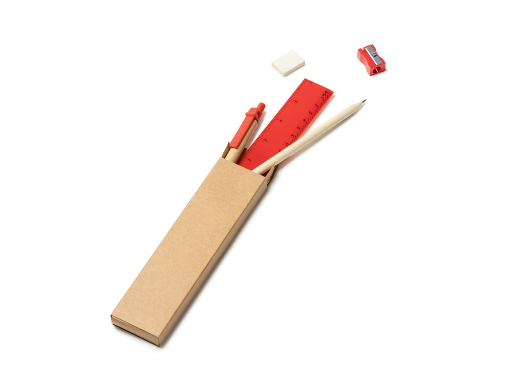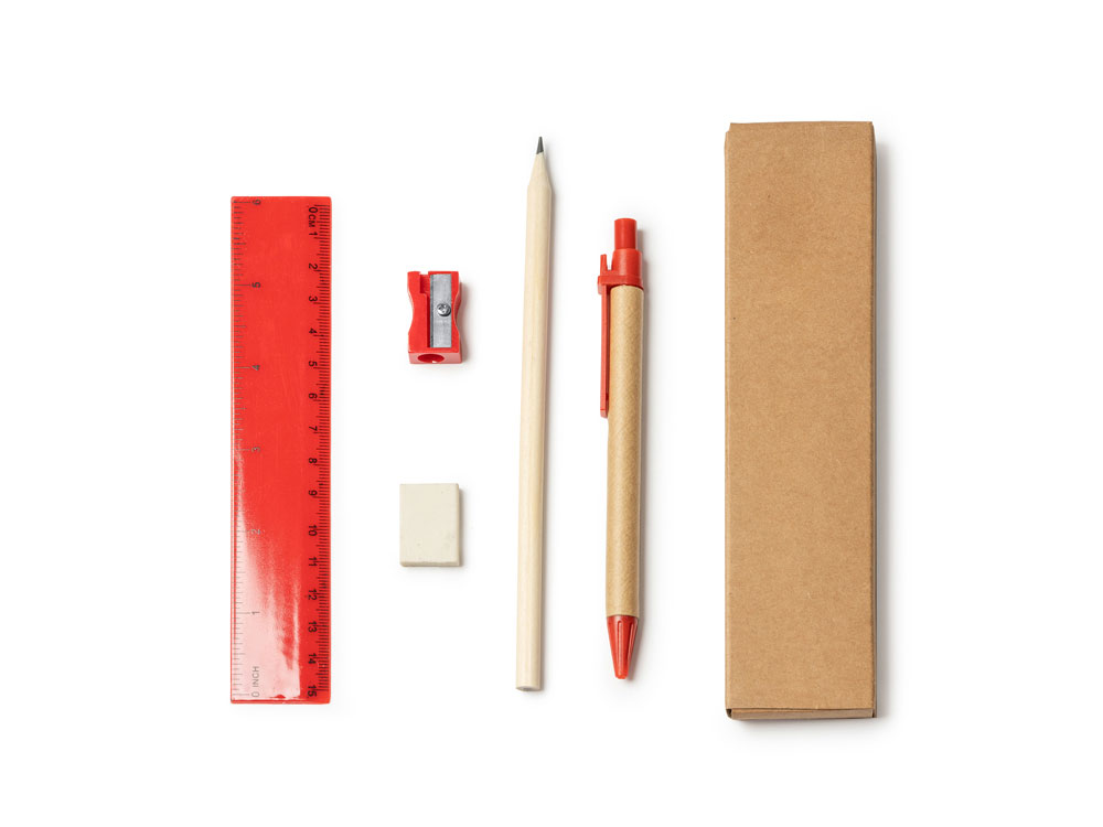 Канцелярский набор. Включает ручку с картонным корпусом и синими чернилами, деревянный карандаш, точилку для карандашей, ластик и линейку длиной 15 см.