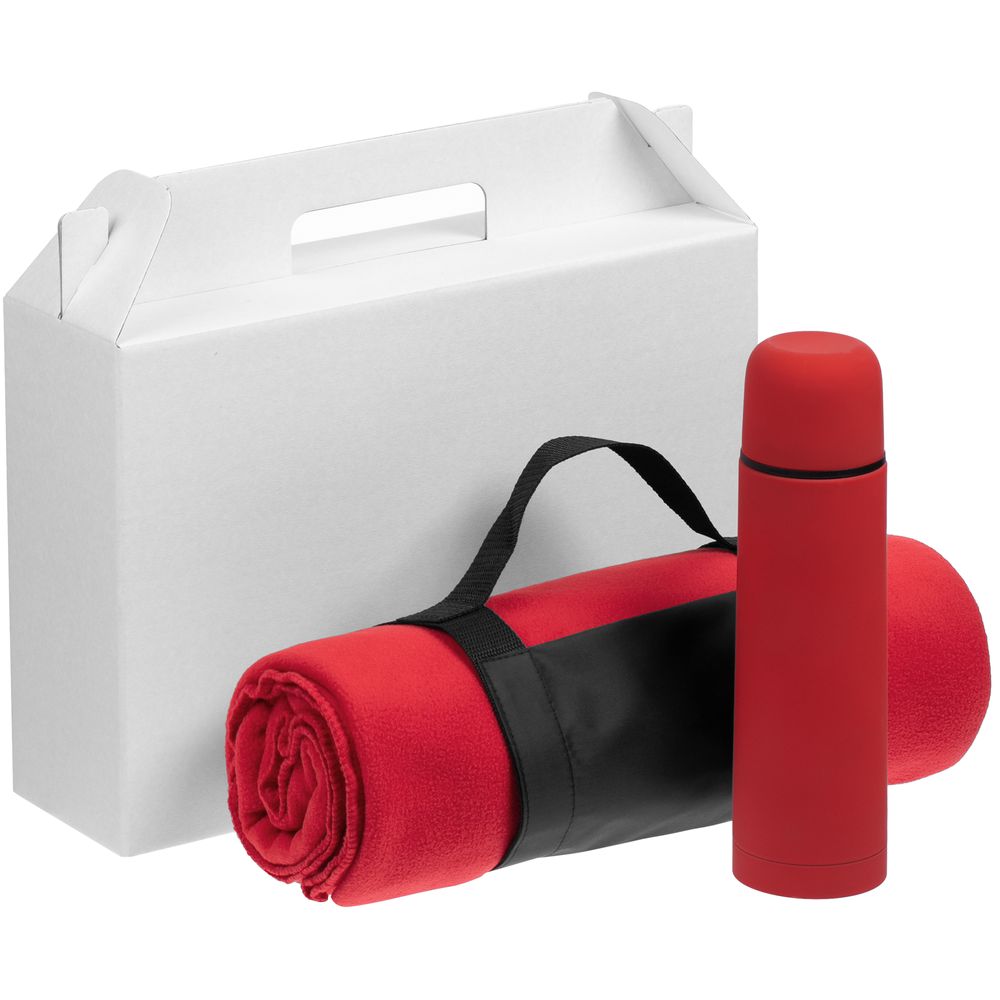 Материал плед - флис, плотность 180 г/м²; термос - нержавеющая сталь, 304 внутри, 201 снаружи, пластик, покрытие софт-тач; коробка - микрогофрокартон