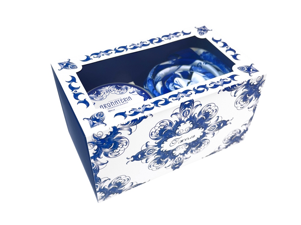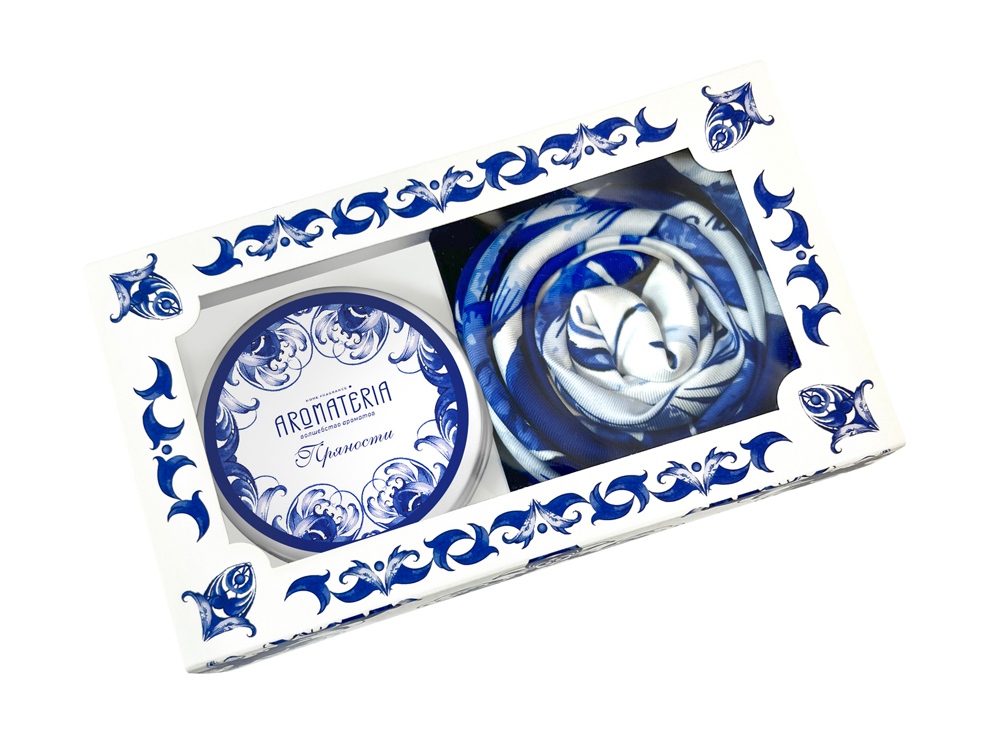 Подобно морозному узору на окне, раскинулся волшебный сад чудесной птицы, где завитки, соцветия и кобальтовые розы созданы в технике Гжель. Платок Гжель и дивная птица счастья – для незабываемых мгновений торжества и блистательного образа! Свеча Пряности дополнит праздничный декор и окутает пространство вуалью притягательного и чуть терпкого аромата, сотканного из нот черного перца, амбры, нероли. Дуэт Птица счастья непременно принесет Вам исполнение желаний в Новом Году! Платок: 70% искусственный шёлк, 30% вискоза, 90х 90 см Свеча: натуральный соевый воск, парфюмерная композиция (объем 100мл/ 20 часов горения)