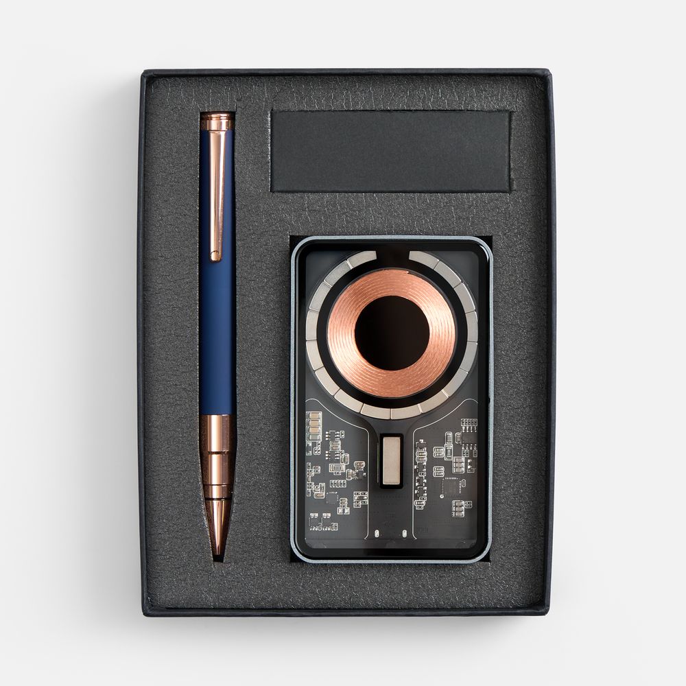 Компактный аккумулятор Cooper Ergo с премиальным корпусом и привлекательной электронной «начинкой» под прозрачной панелью в сочетании с увесистой шариковой ручкой Kugel Rosegold станут идеальным подарком как для коллег, так и для руководителей.