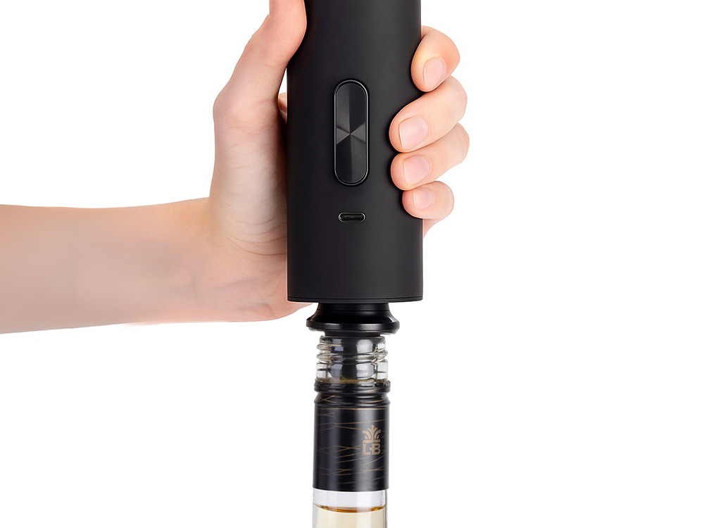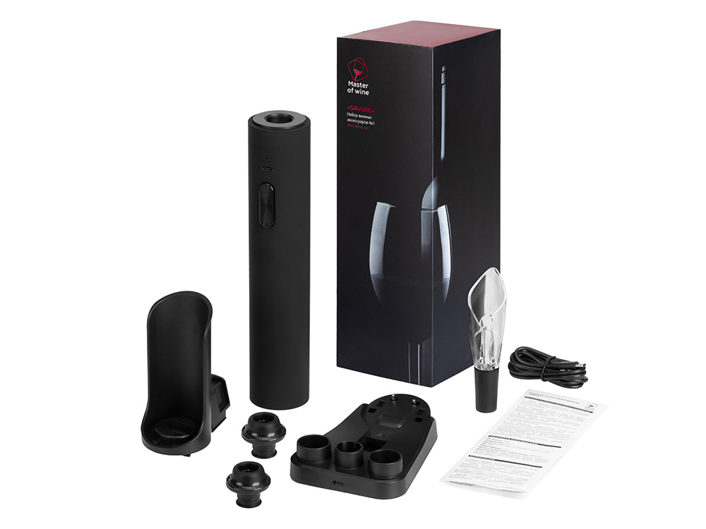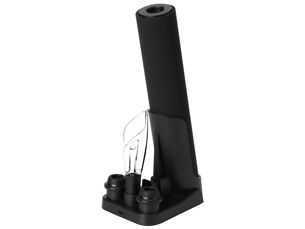 Комплектность электрический штопор-вакуумный насос, нож для срезания фольги, аэратор, вакуумные пробки, зарядная станция, кабель USB-C