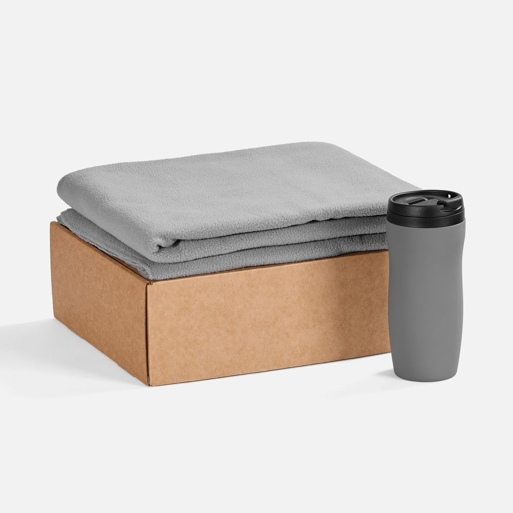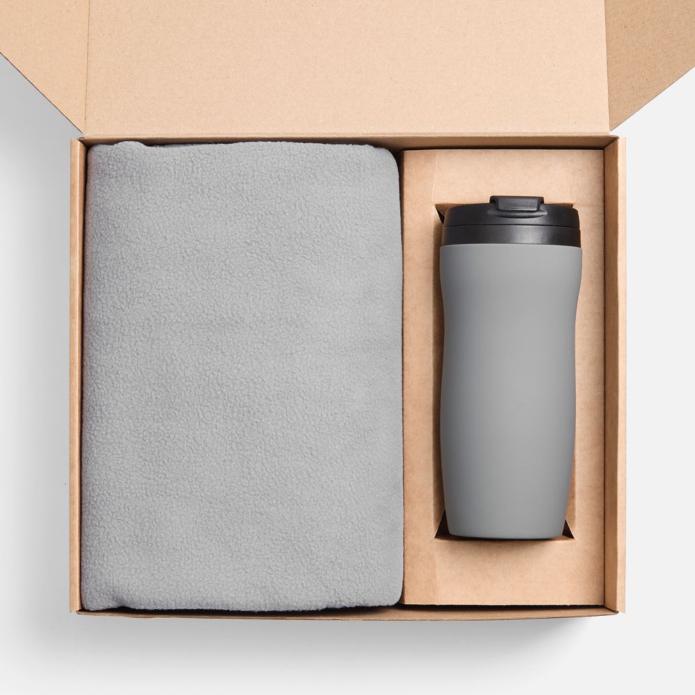 Материал крышка, внутренняя колба - пластик; корпус - нержавеющая сталь; покрытие софт-тач; плед - флис, плотность 180 г/м²; коробка - микрогофрокартон, Т-23Е