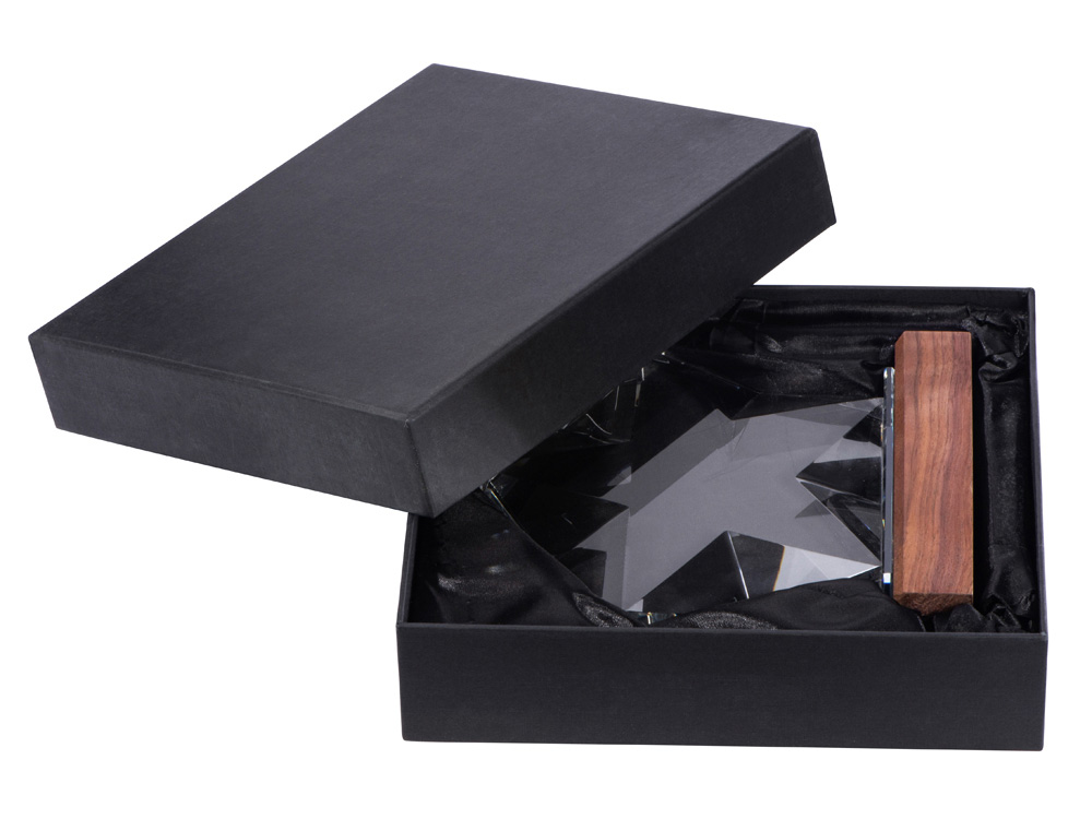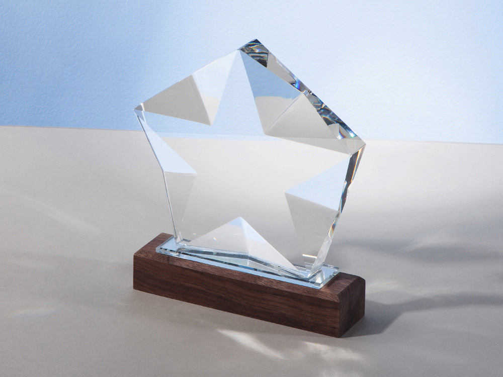 Награда выполнена из прозрачного стекла в виде звезды и расположена на деревянном постаменте. Благодаря выпуклым сторонам она интересно переливается в лучах света. Пятиконечная звезда является символом охраны и безопасности и известна более трёх тысяч лет. • Форма звезды • Прозрачное стекло • Деревянная подставка