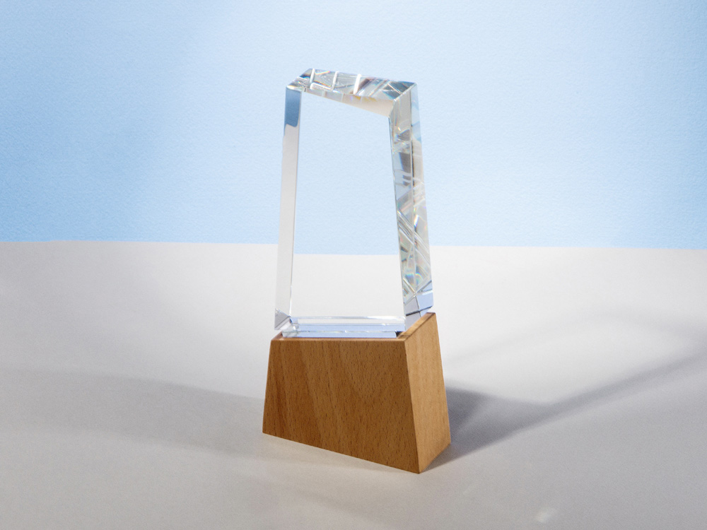 Награда выполнена из прозрачного стекла, имеет необычную форму и расположена на деревянном постаменте. Лаконична и минималистична. • Строгий дизайн • Нестандартная геометрическая форма • Деревянная подставка