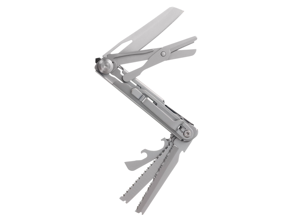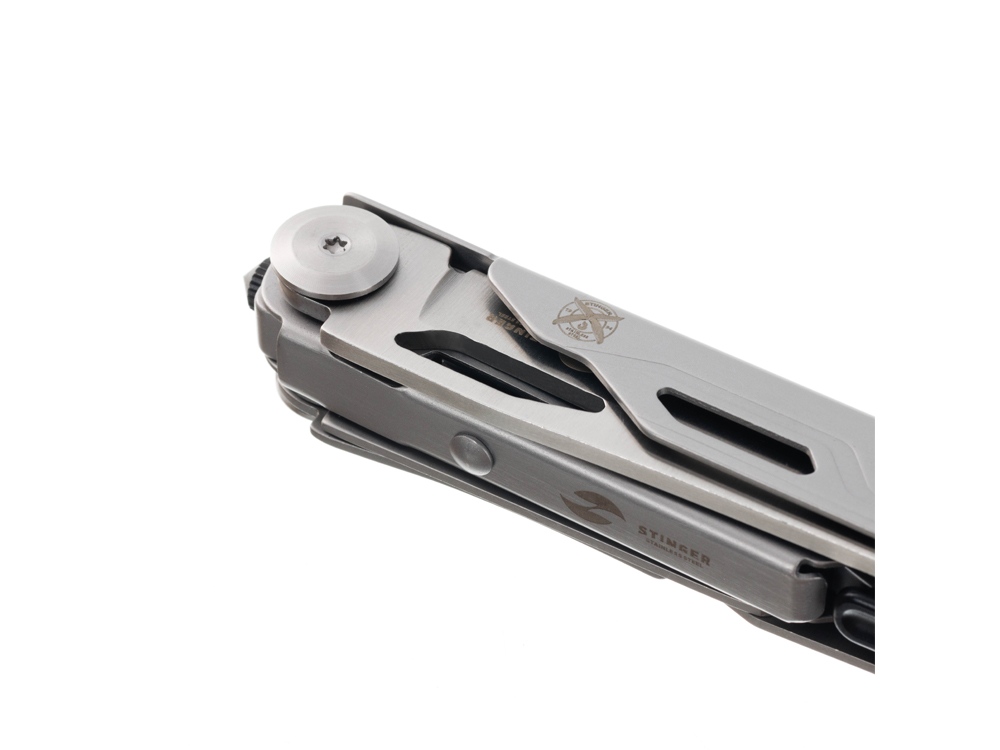 Нож перочинный STINGER имеет 9 функций: 1. Лезвие с фиксатором клинка Liner Lock 2. Ножницы 3. Пила 4. Лезвие с серрейторной заточкой 5. Открывалка для бутылок 6. Консервный нож 7. Инструмент для снятия изоляции 8. Стеклобой 9. Клип ХАРАКТЕРИСТИКИ Материалы • лезвие/инструменты: нержавеющая сталь 440A, твердость 54-58 HRC • рукоять: нержавеющая сталь 440A, твердость 54-58 HRC Размеры • Размеры ножа: 112х20х25 мм • Общая длина: 185,5 мм • Длина клинка: 79,3 мм • Наибольшая ширина клинка: 17 мм • Толщина обуха: 2,5 мм • Длина рукояти: 111,3 мм • Ширина рукояти (в ср.части): 19,4 мм • Толщина рукояти (в ср.части): 18,9 мм Вес: 141 г Цвет: серебристый Упаковка: картонная коробка