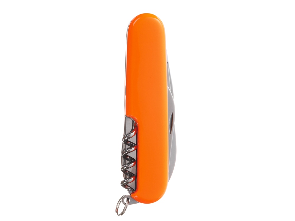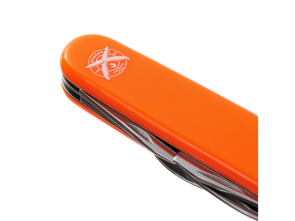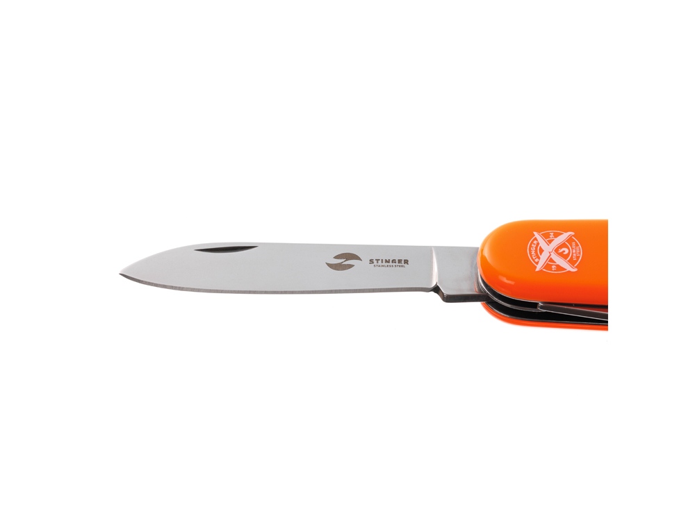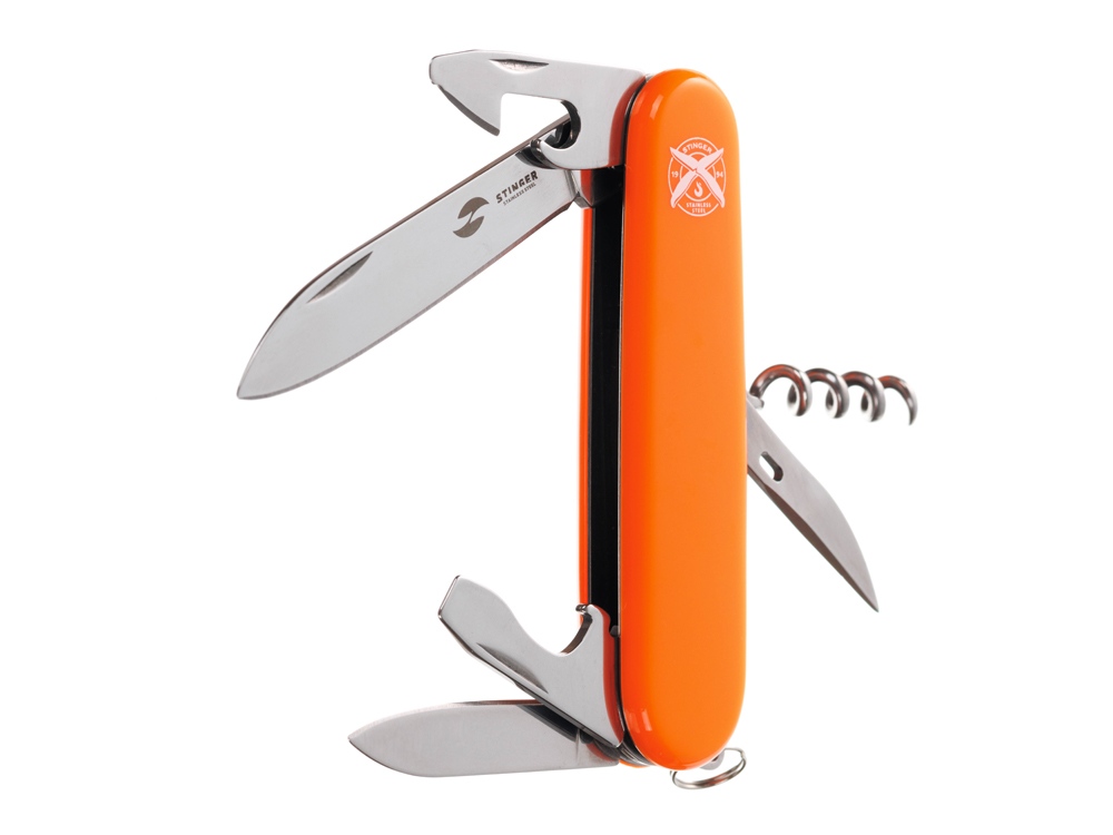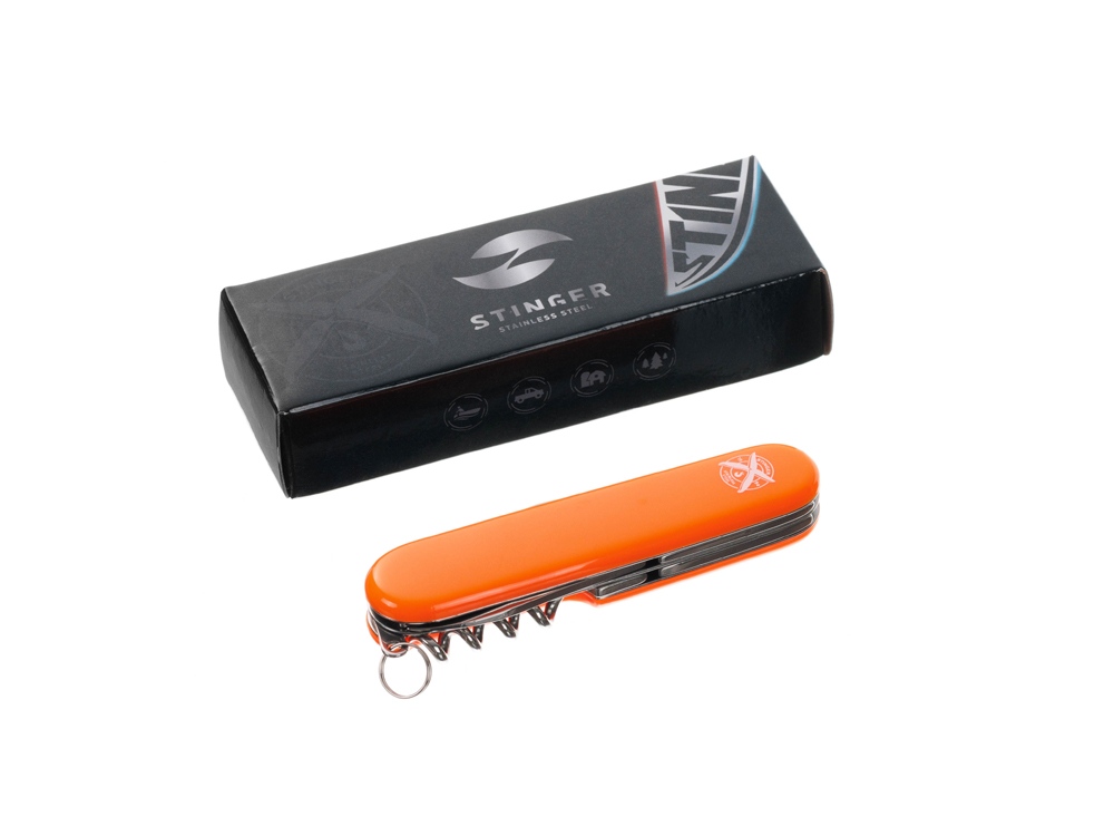Нож перочинный STINGER имеет 11 функций: 1. Большое лезвие 2. Малое лезвие 3. Консервный нож с: 4. - Малой отверткой 5. Штопор 6. Шило с: 7. - Иглой 8. Открывалка для бутылок с: 9. - Отверткой 10. - Инструментом для снятия изоляции 11. Кольцо для ключей ХАРАКТЕРИСТИКИ Материалы • лезвие/инструменты: нержавеющая сталь 420, твердость 44-48 HRC • рукоять: нержавеющая сталь 420, твердость 44-48 HRC • накладки рукояти: АБС-пластик Размеры • Размеры ножа: 90х26,5х14 мм • Общая длина: 160,4/131,3 мм • Длина клинка: 67,8/40,4 мм • Наибольшая ширина клинка: 12,4/9,4 мм • Толщина обуха: 2,5/1,5 мм • Длина рукояти: 92,6/90,9 мм • Ширина рукояти (в ср.части): 20,6 мм • Толщина рукояти (в ср.части): 15 мм Вес: 80 г Цвет накладок рукояти: оранжевый Накладки рукояти ножа не подлежат замене. Упаковка: картонная коробка