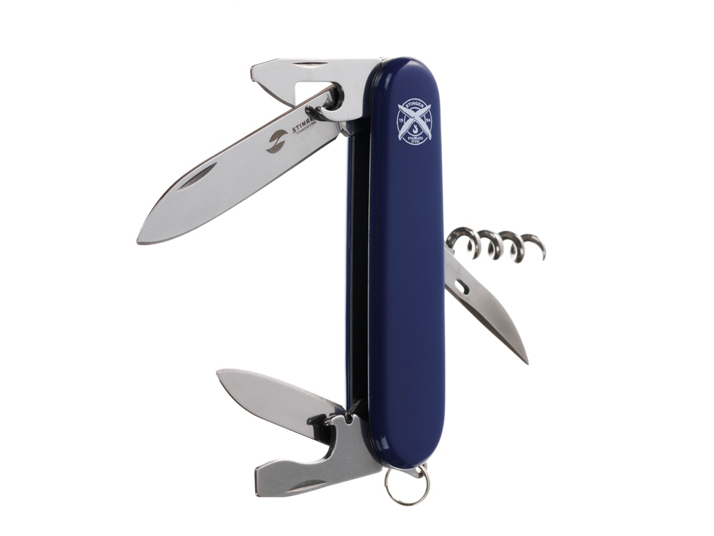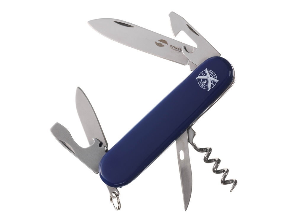 Нож перочинный STINGER имеет 11 функций: 1. Большое лезвие 2. Малое лезвие 3. Консервный нож с: 4. - Малой отверткой 5. Штопор 6. Шило с: 7. - Иглой 8. Открывалка для бутылок с: 9. - Отверткой 10. - Инструментом для снятия изоляции 11. Кольцо для ключей ХАРАКТЕРИСТИКИ Материалы • лезвие/инструменты: нержавеющая сталь 420, твердость 44-48 HRC • рукоять: нержавеющая сталь 420, твердость 44-48 HRC • накладки рукояти: АБС-пластик Размеры • Размеры ножа: 90х26,5х14 мм • Общая длина: 160,4/131,3 мм • Длина клинка: 67,8/40,4 мм • Наибольшая ширина клинка: 12,4/9,4 мм • Толщина обуха: 2,5/1,5 мм • Длина рукояти: 92,6/90,9 мм • Ширина рукояти (в ср.части): 20,6 мм • Толщина рукояти (в ср.части): 15 мм Вес: 80 г Цвет накладок рукояти: синий Накладки рукояти ножа не подлежат замене. Упаковка: картонная коробка