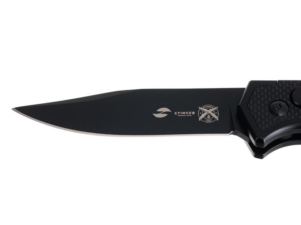 НОЖ СКЛАДНОЙ STINGER Автоматический складной нож из высококачественных материалов, идеально подойдет для повседневного использования. Рукоять ножа изготовлена из нержавеющей стали с накладками из стеклотекстолита G10 - композитного материала на основе стеклоткани и эпоксидной смолы. G10 является прочным и ударостойким материалом, отлично переносит влагу, отличается повышенной стойкостью к огню. Рукоять ножа собрана на втулках - бонках, поэтому при необходимости его можно легко промыть. На рукояти расположена съемная клипса для удобного размещения ножа в кармане. Нож легко открывается и надежно фиксируется благодаря замку Button Lock. Клинок изготовлен из нержавеющей стали 8CR14MoV. Основное преимущество этой стали - отличное противодействие коррозии благодаря высокому содержанию хрома (14,5%). Сталь 8CR14MoV относится к высокоуглеродистым сталям (0,8%), углерод в составе придает сплаву твердость в диапазоне 57-59 HRC, что позволяет режущей кромке лезвия длительное время оставаться острой. Оптимальное содержание легирующих элементов придает стали гибкость, лезвие хорошо поддается правке и заточке. Клинок из стали 8CR14MoV отличается высокой прочностью и устойчивостью к износу, имеет долгий срок службы, обеспечивает качественный и точный срез. Характеристики: Материал клинка: нержавеющая сталь 8CR14MoV Твердость по шкале Роквелла: 57-59 HRC Материал рукояти: нержавеющая сталь/стеклотекстолит G10 Метод открывания клинка: автомат Фиксатор клинка: Button Lock Длина ножа: 195 мм Длина клинка: 80 мм Толщина клинка: 3,5 мм Вес: 130 г Цвет рукояти: черный Особенности: рукоять с клипом В комплекте: нейлоновый чехол