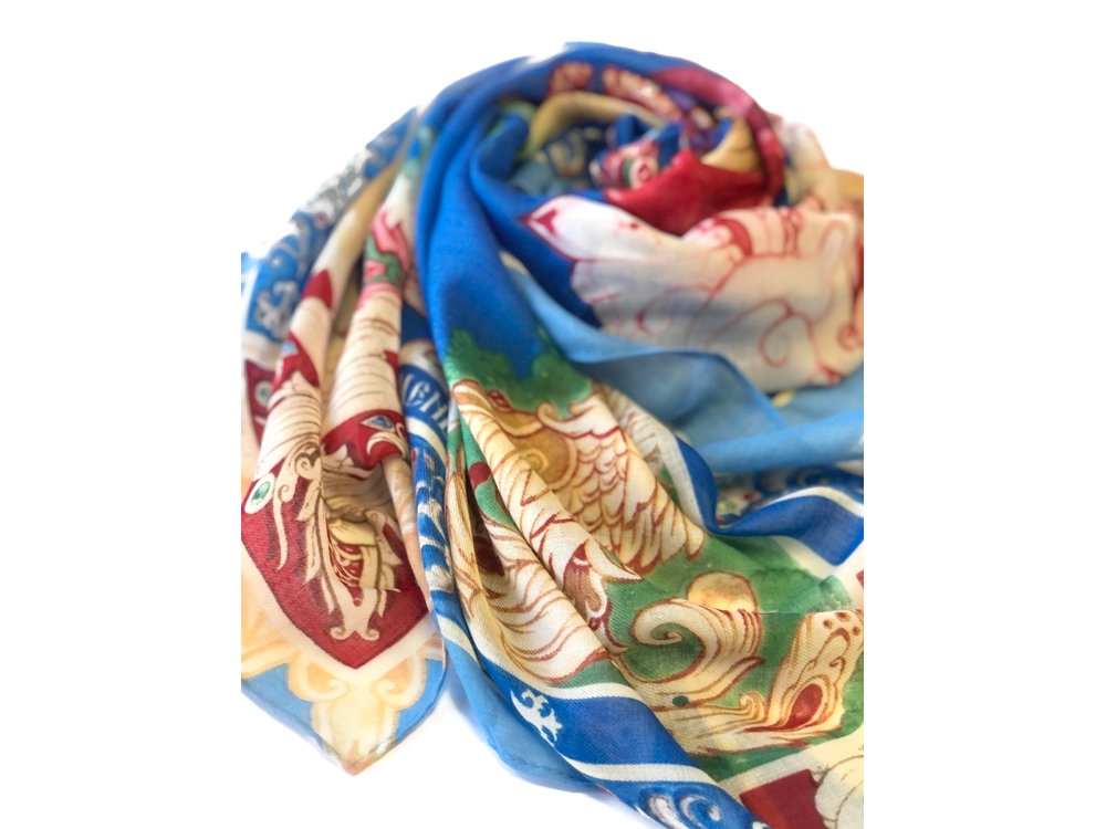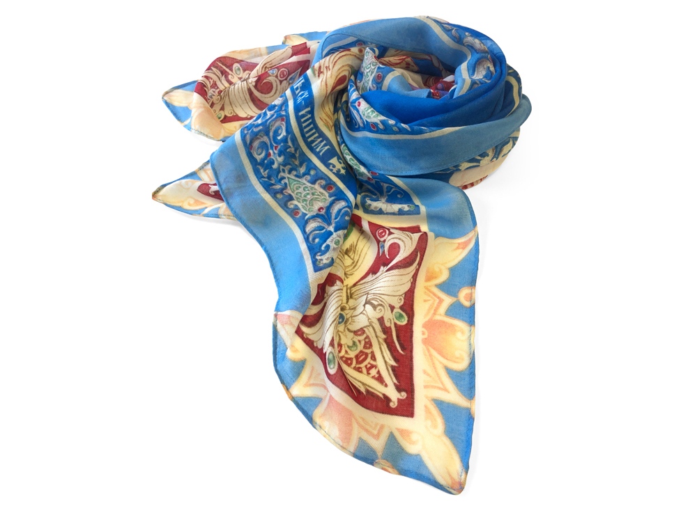 За горами, за лесами, За широкими морями, Не на небе - на земле Жил старик в одном селе… Известные каждому напевные строки сказки Конек-Горбунок неизменно возвращают нас в волшебный мир детства. Их автор – Петр Ершов – родился в 1815 году в маленьком селе Безруково Ишимского уезда Тобольской губернии, и, будучи еще совсем молодым, яркой звездой взошел на литературном небосклоне России. Прочитав сказку юного дарования, сам великий Александр Сергеевич Пушкин сказал: Этот род сочинений я могу теперь оставить - и Петр Ершов был принят в круг петербургских писателей.В этом году сказке из золотого фонда русской литературы, переведенной на все языки мира, исполняется 185 лет. Ее яркие краски мы перенесли на шелк и создали платок Конек-Горбунок. Благодаря тонкой работе дизайнера, со страниц книги, как живые, сошли герои любимой с детства истории: Иван, прекрасная Царь-девица и волшебный Конек-Горбунок. А в роскошных орнаментах сплелись легендарное перо Жар-птицы, Красное Солнышко и Месяц… Пусть этот платок принесет в Вашу жизнь немного чуда и наполнит ее вдохновением!