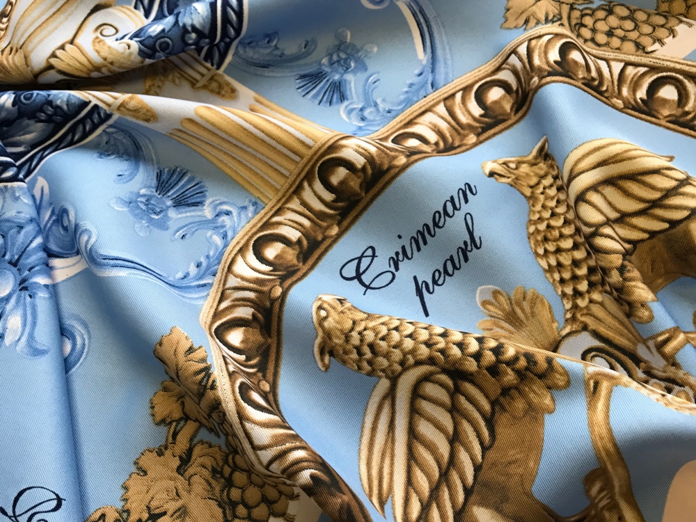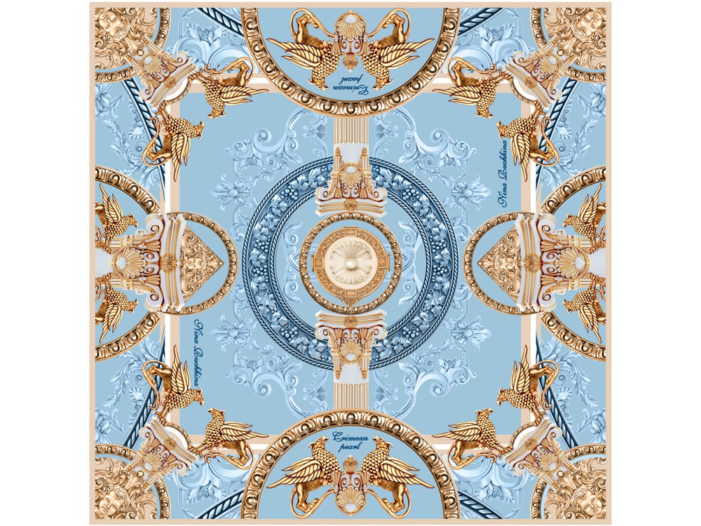 Общее решение платка соотносится с интерьерами церемониальных залов восхитительных крымских дворцов. Во все времена сильные мира сего возводили в Крыму выдающиеся произведения архитектурного мастерства. Колонны, барельефы и замысловатый декор многочисленных стилей и эпох - визитные карточки Крымского полуострова, они навсегда пленили моё сердце и душу. В центре композиции - драгоценная жемчужина - дар природы, символ уникальности Крыма, его неисчислимых богатств, красоты и щедрости. Дополнительно, именно жемчуг олицетворяет женское начало, совершенство и тайное знание, а также чистоту и возвышенность. Нежно-голубой фон цвета неба и воды обволакивает романтикой, морские канаты напомнят о могуществе Черноморского флота. Виноградные лозы, обрамляющие центральную композицию, расскажут об истории виноделия, которое зародилось в Крыму ещё в античные времена. Финальный штрих - царственные грифоны - символы могущества и власти, непоколебимо охраняющие великолепие райского уголка. Стражи сокровищ привносят законченность, утончённость и неподдельную роскошь в общую композицию и призваны охранять самую драгоценную жемчужину мира - прекрасную обладательницу платка. Советы по уходу: -Наши платки сделаны с душой и нуждаются в ответной душевной заботе и внимании. -Они практически не мнутся, очень приятные на ощупь, нежные и мягкие. Любят бывать на людях, посещать светские мероприятия, не выносят одиночества. -Всегда готовы к экспериментам и смелым сочетаниям. Прослужат верой и правдой долгие годы, никогда не выйдут из моды и всегда будут уместны и кстати. -Ручная стирка 40 градусов.