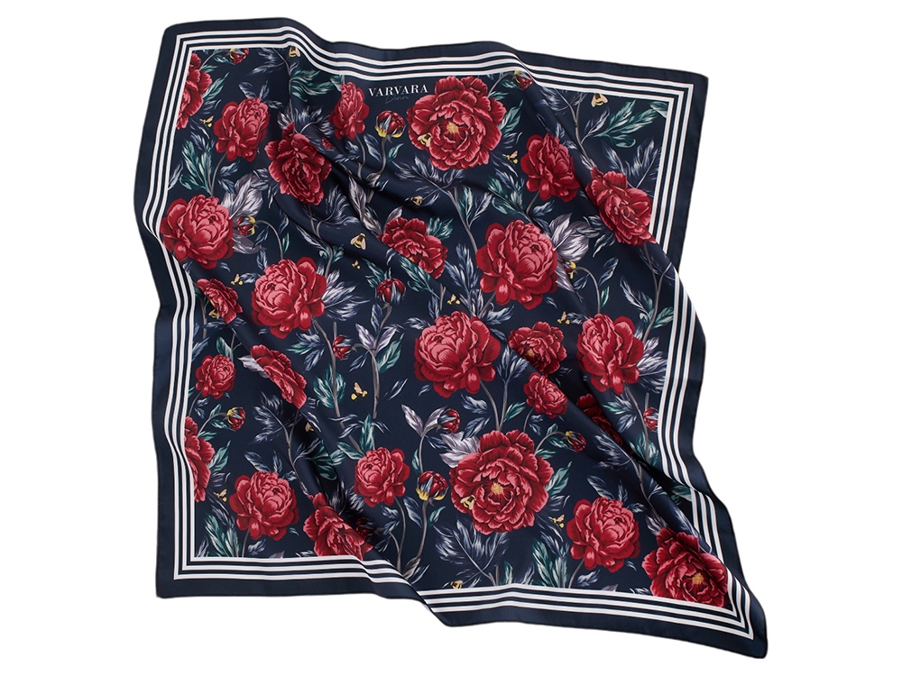 Платок из струящегося искусственного шелка, размером 70х70 см. Упакован в подарочный тубус.