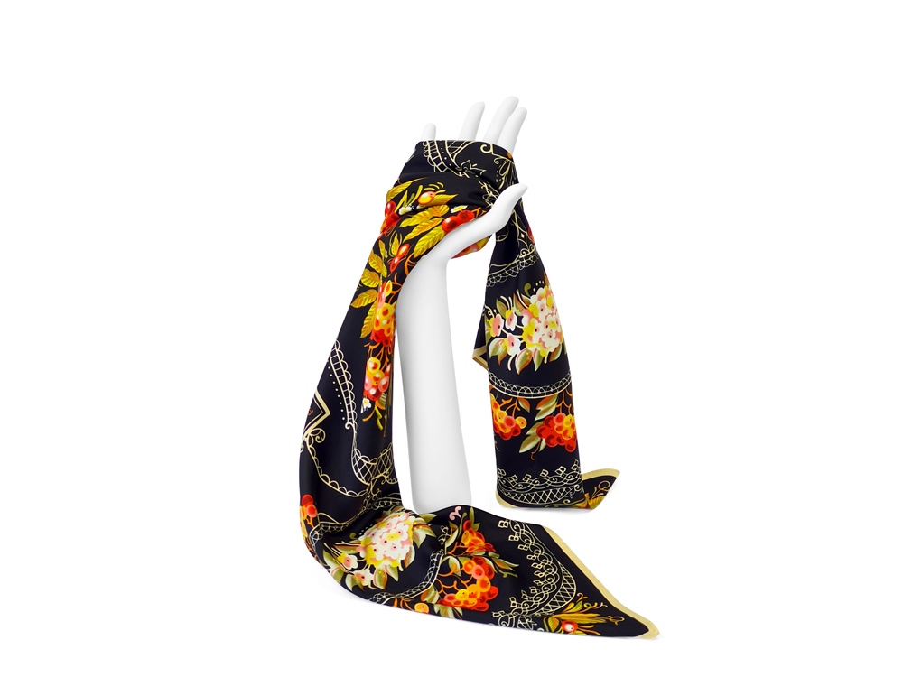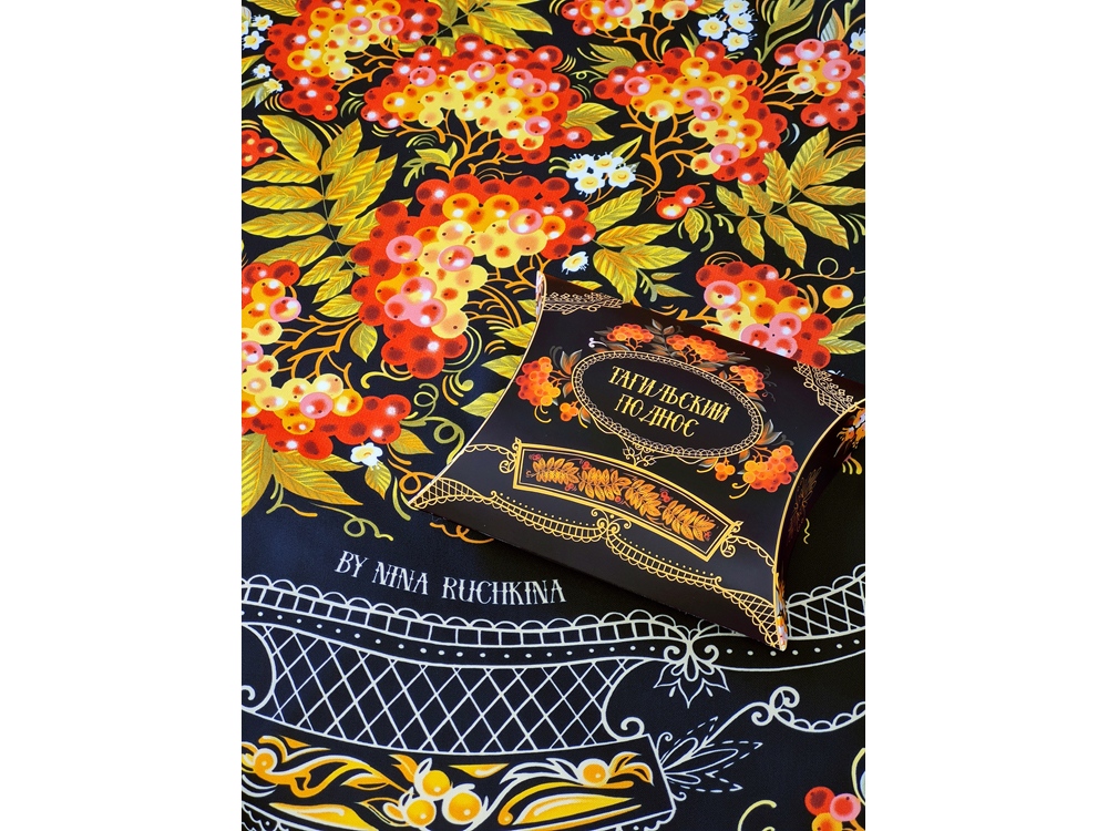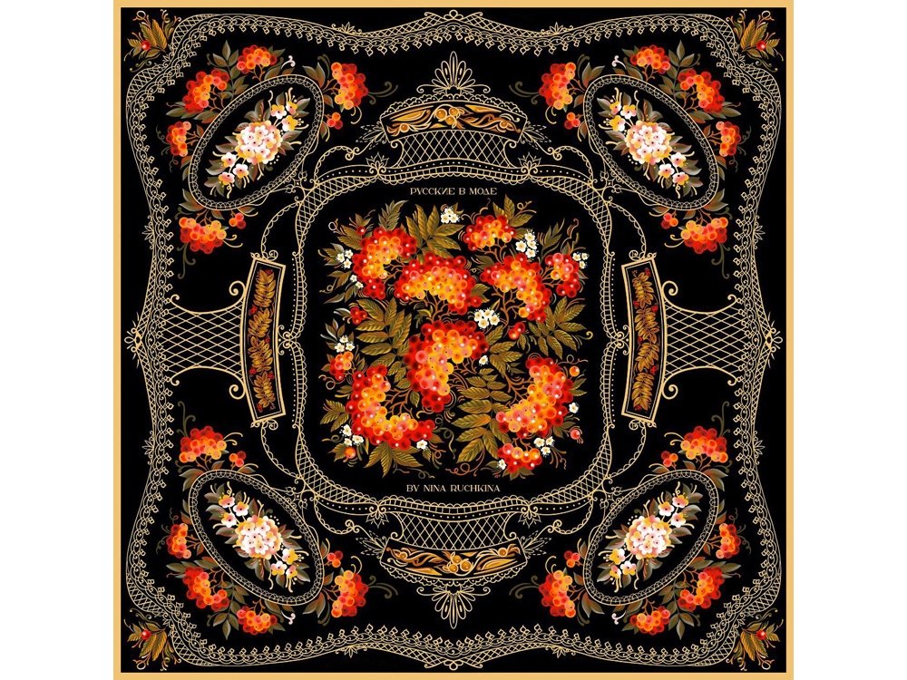 Нижний Тагил - крупнейший промышленный центр Урала, является родиной русского расписного железного подноса. Искусство уральской лаковой росписи, зародившееся в 40-е годы XVIII столетия и активно развивающееся в XXI, обогатило художественную культуру России. В нем воплотился сплав высокого профессионального мастерства, кропотливого труда художников по металлу, стремление к прекрасному и талант народных живописцев. Русская рябина - излюбленный сюжет мастеров тагильского подноса. Она абсолютно уникальна и узнаваема. Эскиз платка дополнят утонченная вязь орнаментов и ажурные решетки, присущие исключительно этому промыслу. Платок Тагильский поднос станет ярким акцентом в вашем гардеробе. Насыщенная терракотово-чёрная цветовая гамма плодов всегда актуальна, а нежные оттенки цветов рябины внесут настроение романтичности и легкости.