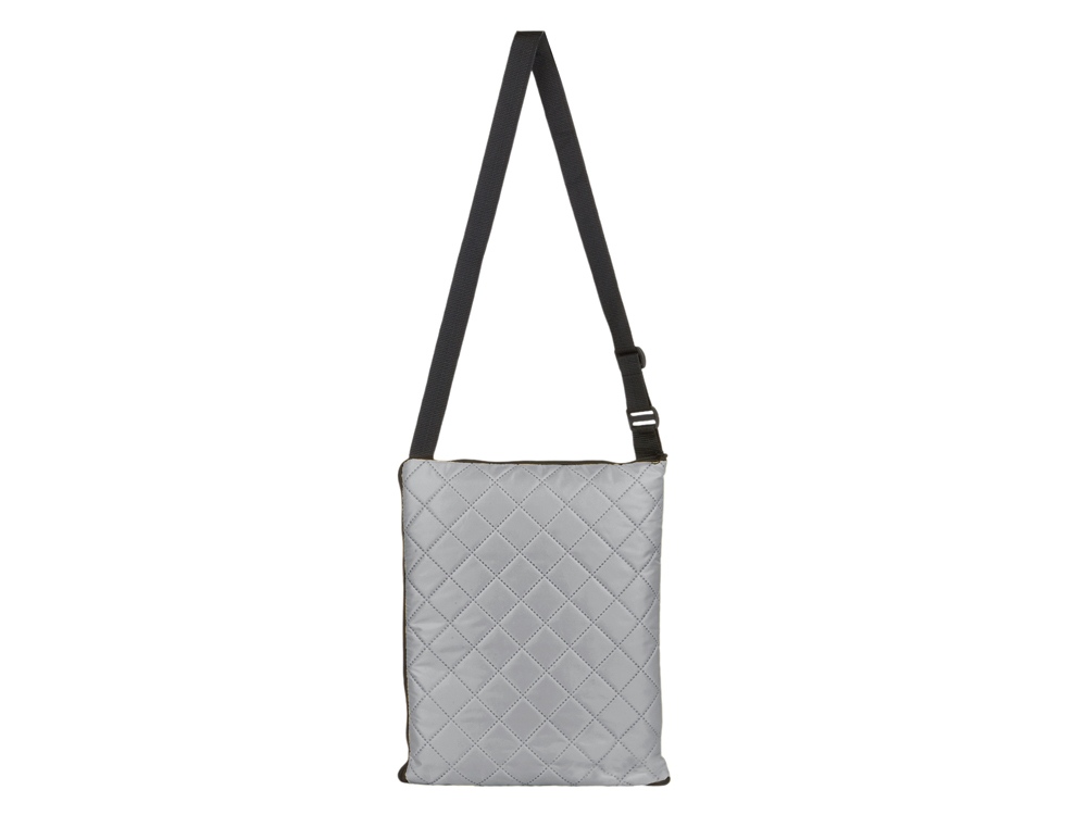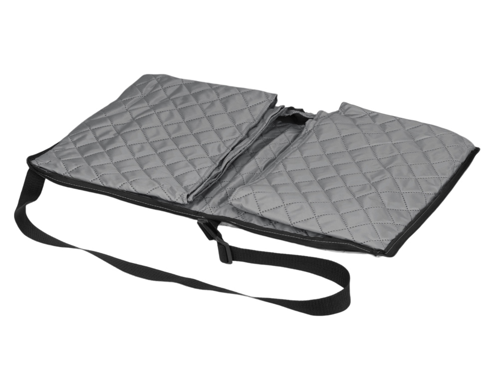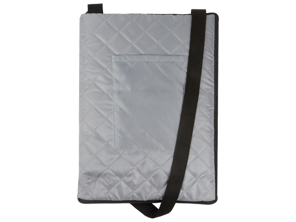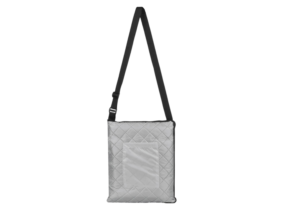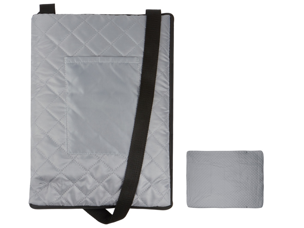 Двухсторонний плед с водоотталкивающим покрытием с одной стороны и мягким флисом с другой. Складывается в сумку на плечо и фиксируется с помощью молнии. В собранном виде имеет регулируемый по длине ремень для переноски и наружный карман для мелочей.