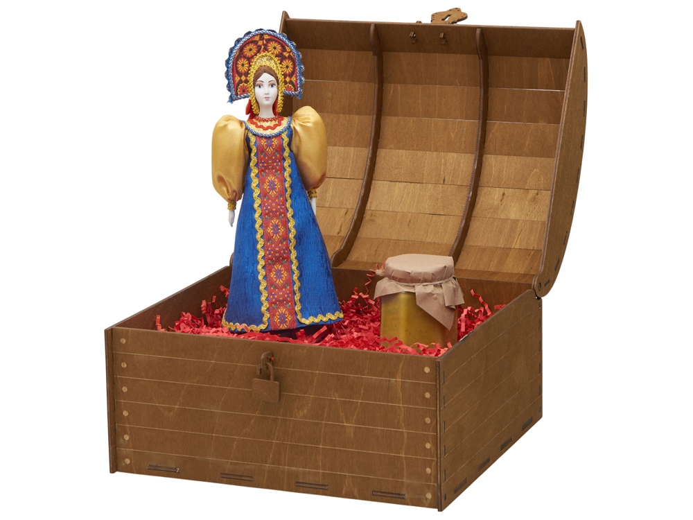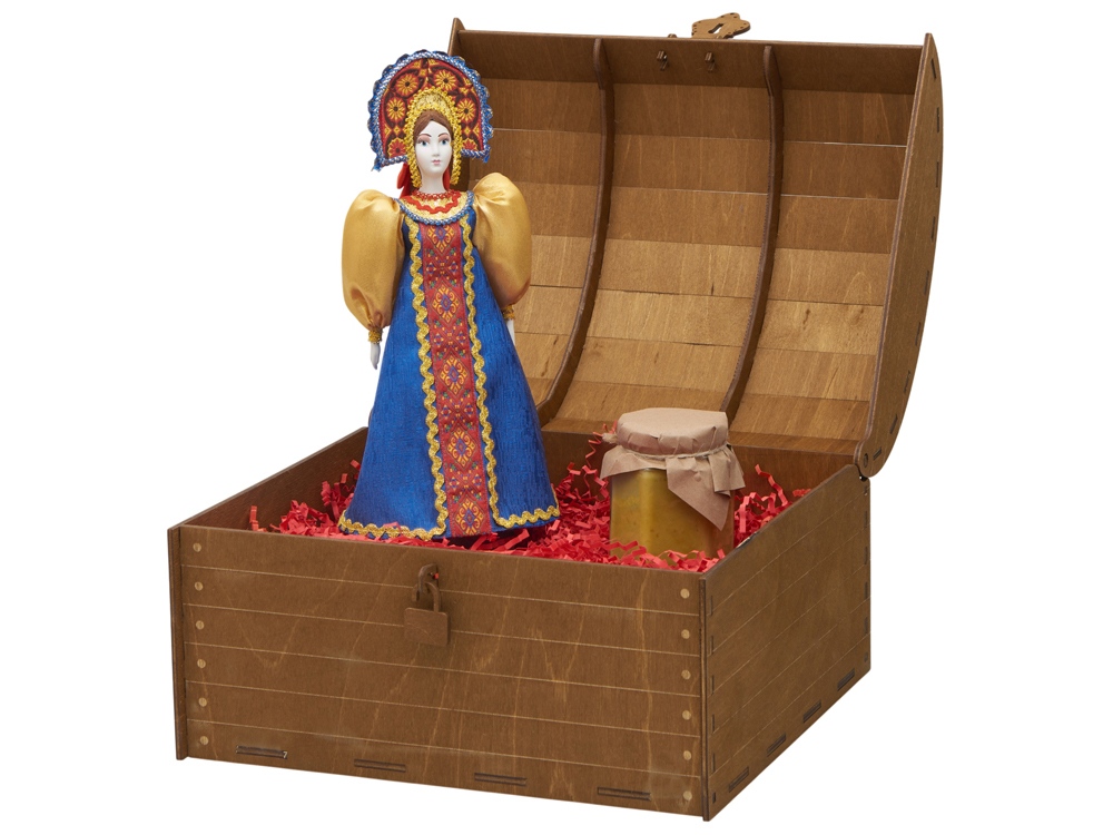 Очарование русских традиций, домашнего уюта и изысканных вкусов соединилось в этом уникальном подарке. Набор создан для тех, кто ценит подлинную красоту и желает подарить незабываемые эмоции. Что внутри: - Фарфоровая кукла в народном костюме ручной работы: расписной сарафан и кокошник с традиционной вышивкой воссоздают образ русской красавицы. - Крем-мёд с лаймом и имбирём (250 г): нежная текстура с яркой цитрусовой ноткой и тёплым имбирным оттенком. Изысканное лакомство для истинных гурманов. - Элегантное оформление: декоративная стружка придаёт композиции глубину и благородство, бережно сохраняя все элементы набора. Роскошная упаковка: деревянный сундук с изящным замочком превращает вручение подарка в особый ритуал. Дополнительное брендирование шильдом спектрум делает презент эксклюзивным и памятным. Идеальный выбор для тех, кто ищет не просто сувенир, а настоящее произведение искусства с русской душой.