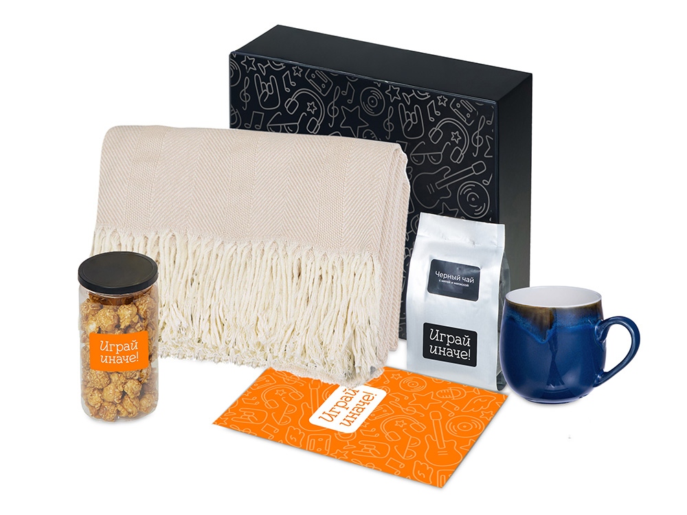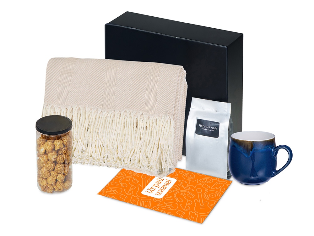 | Материал товара | плед - 100% хлопок, кружка - костяной фарфор с покрытием софт-тач, чай - пластик, попкорн - пластик, металл, мешок - нетканый материал (спанбонд), коробка - картон |