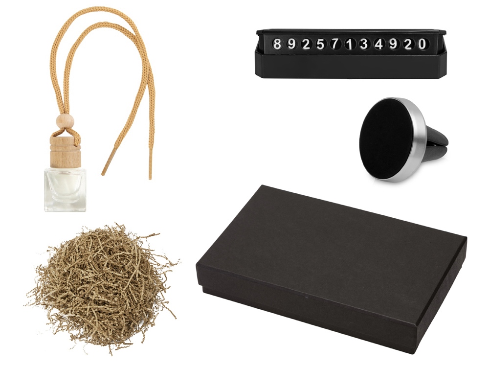 Магнитный держатель для телефона крепится к вентиляционной решетке автомобиля по принципу булавки-пина: вам нужно просто воткнуть держатель в решетку, где он плотно закрепится прорезиненными ножками. Самоклеящаяся стальная пластина для крепления к телефону идет в комплекте. Компактная табличка с номером телефона - отличное решение проблем при парковке. Табличка двусторонняя, что позволяет оставлять два номера телефона. При необходимости номер легко скрыть. Бамбуковая крышка ароматизатора отлично впитывает и долго держит аромат. Благодаря привлекательному внешнему виду диффузор станет отличным украшением салона автомобиля, комнаты или офиса. Для усиления эффекта необходимо перевернуть емкость на 1-2 секунды. - отдельный футляр для телефонной таблички; - телефонная табличка с двумя сменными блоками с цифрам; - прорезиненная поверхность держателя не царапает заднюю крышку смартфона; - флакона ароматизатора хватает в среднем на 2 месяца; - подарочная коробка с наполнителем уже включена в набор.