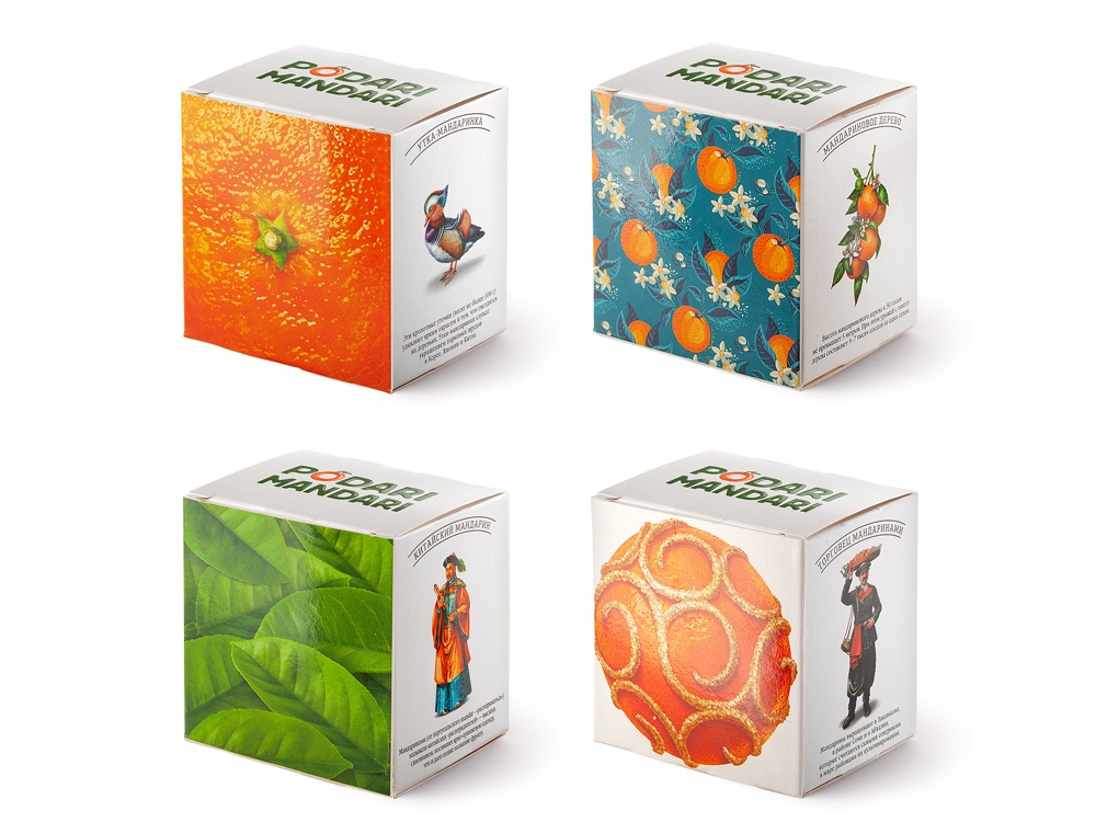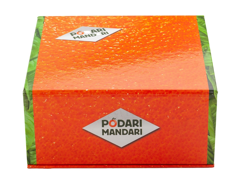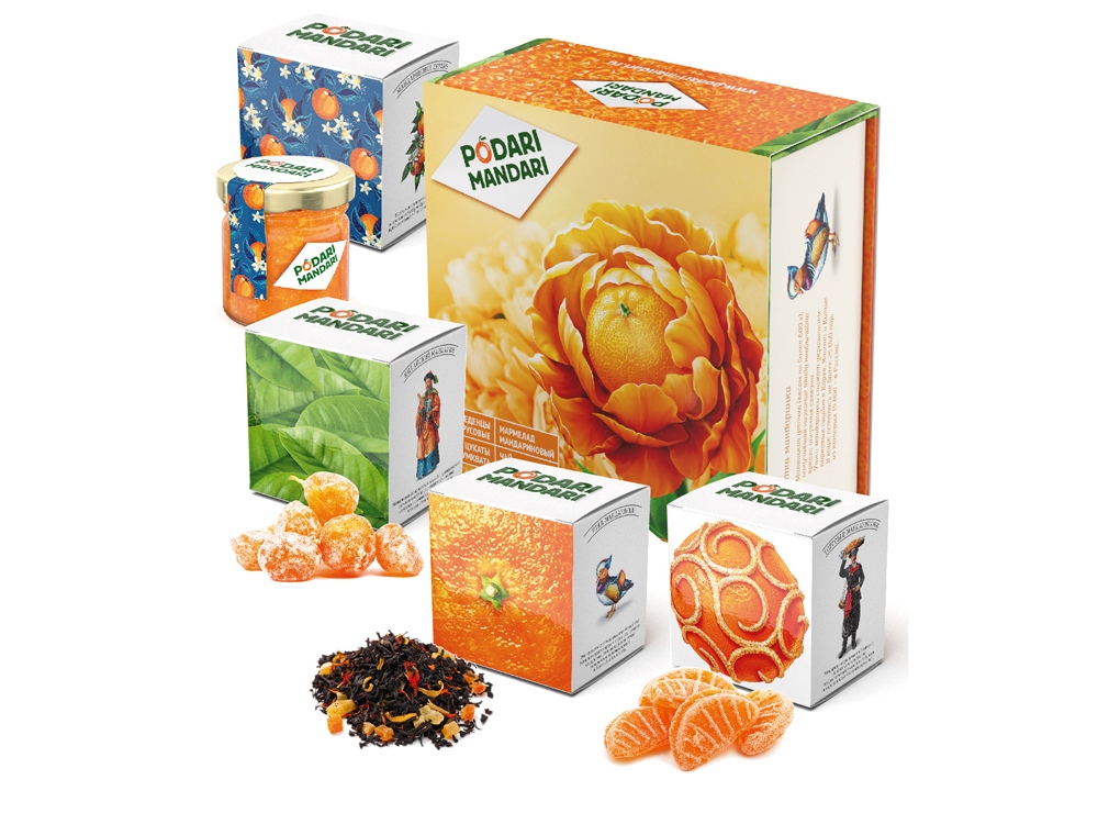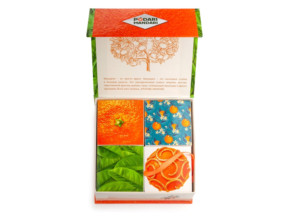 Гастрономический подарочный набор ПодариМандари. Набор представляет собой метафору мандарина – одного из главных символов Нового года. Состоит из 4 продуктов: – чай с цедрой, сегментами и цветами апельсина; – мармелад из мандаринов; – цукаты из кумквата; – цитрусовые леденцы. Продукты упакованы в небольшие картонные коробочки размером 70 х 70 х 55 мм и помещены в шкатулку из переплётного картона с магнитным клапаном. Состав: Кумкват: кумкват, сахар, Е220. Мармелад: сахар, мандариновое пюре, патока, лимонная кислота, пектин. Чай: чай черный байховый, лепестки календулы, ягоды облепихи, имбирь, кусочки апельсина, шелковица. Леденцы: патока, вода, регуляторы кислотности (лимонная кислота, молочная кислота), ароматизаторы, идентичные натуральным, краситель: аннато, сахар.