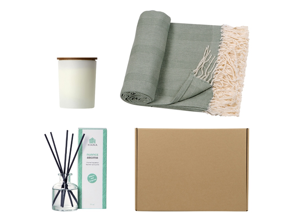 | Материал товара | плед - 100% хлопок, аромат для дома - стекло, фибровые палочки, свеча - воск, стекло, дерево, коробка - картон |