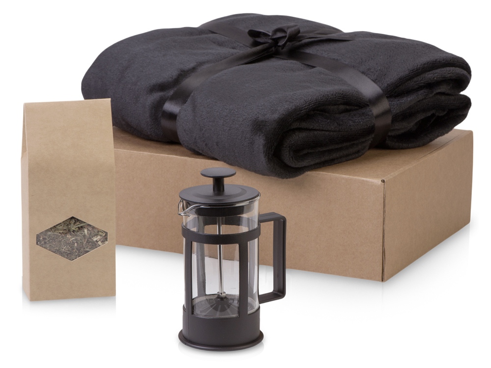 Набор продуман до мелочей. Когда зимним вечером подходит время чая, хочет завернуться в мягкий и теплый плед и наслаждаться любимым напитком, который можно заварить во френч прессе, входящем в комплект. Набор упакован в стильную крафтовую коробку.
