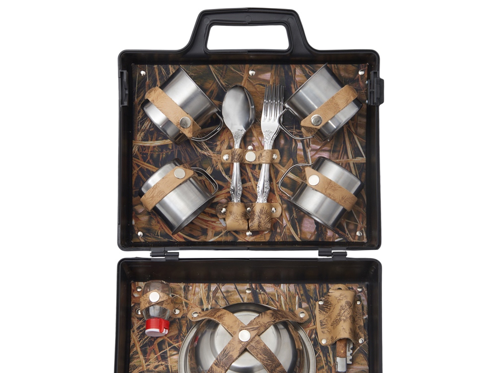 Погрузитесь в атмосферу комфорта и стиля с нашим подарочным набором. Этот тщательно подобранный комплект идеально подходит для тех, кто ценит качество и удобство во время отдыха на природе. В комплекте: - Кружки 200 мл. (нерж. сталь)- 4 шт - Вилки (нерж. сталь)- 4 шт - Ложки (нерж. сталь)- 4 шт - Тарелки 700 мл. (нерж. сталь)- 4 шт - Миска 1000 мл. (нерж. сталь)- 1 шт - Складной нож- 1 шт - Зажигалка- 1 шт. - Емкости для соли и перца- 2 шт. Все аксессуары упакованы в пластиковый кейс и надежно закреплены ремешками из натуральной кожи, что обеспечивает удобство транспортировки и сохранность содержимого. Набор Походный – это идеальный выбор для похода на несколько дней, дружеской встречи или семейного отдыха на природе.