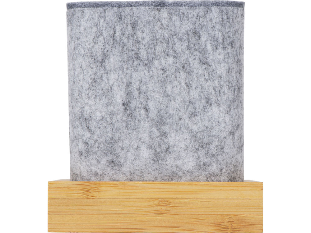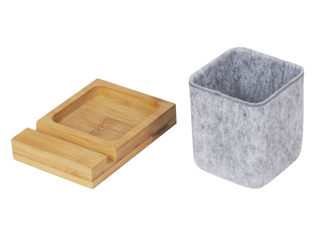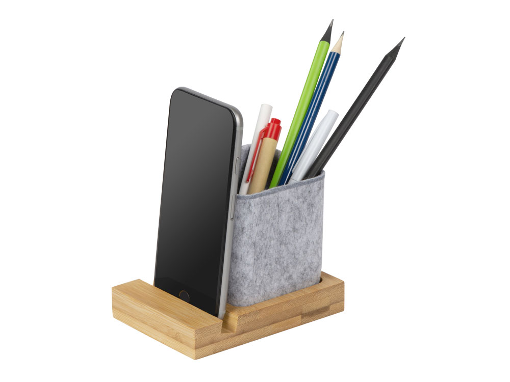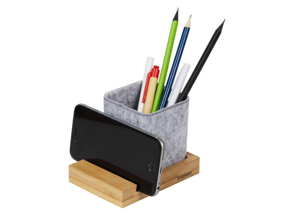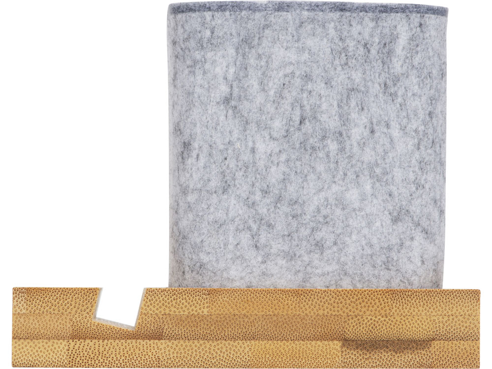 Подставка на рабочий стол для ручек и карандашей из RPET-фетра на подставке из бамбука. У бамбуковой подставки выемка 10 мм, в которую можно поставить телефон.