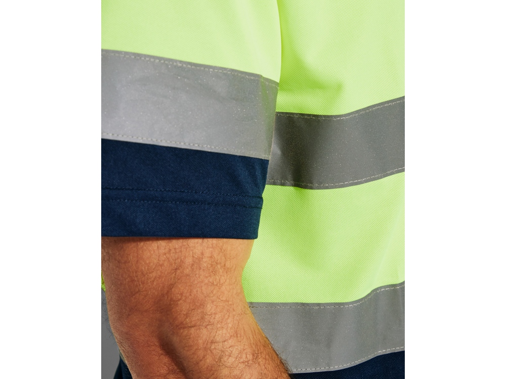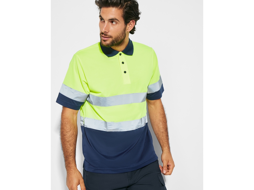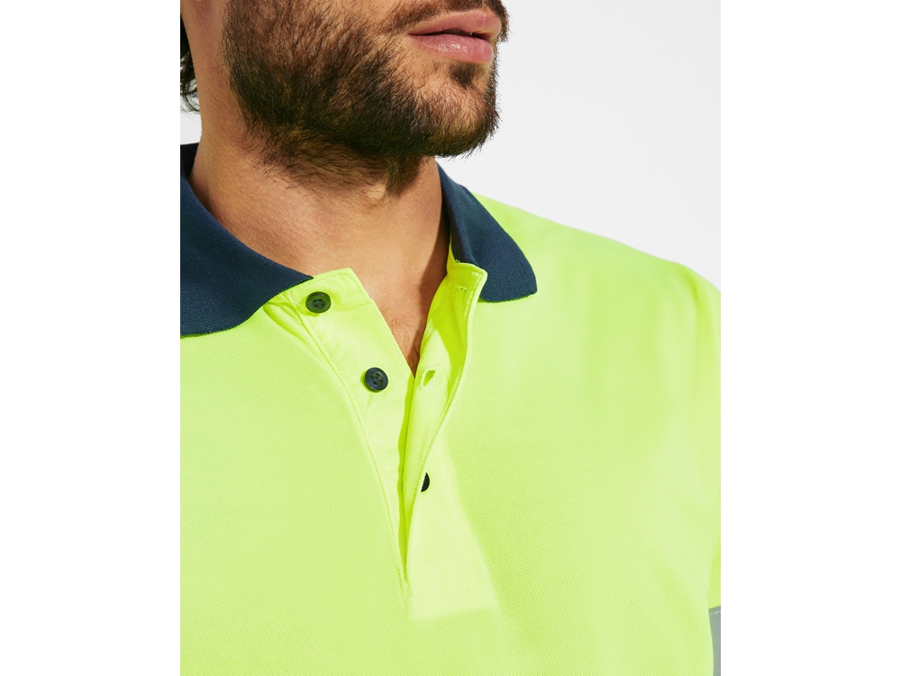 Техническая рубашка поло с короткими рукавами. Планка на 3 пуговицы. Воротник из риба 1 x 1. Две горизонтальные светоотражающие полосы на туловище и рукавах. Ткань предотвращает зацепление.