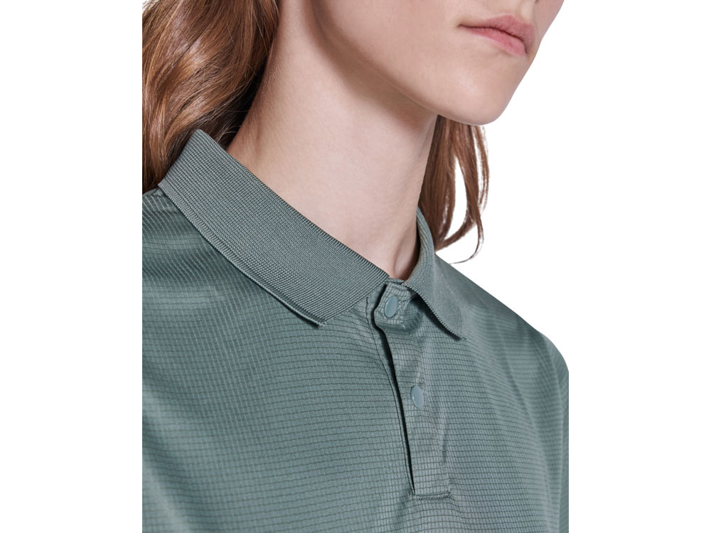 Женское приталенное полос коротким рукавом из технологичного полотна. Рибовый воротник 1х1, застежка на кнопки. Отстрочка в тон. Рибовые манжеты.
