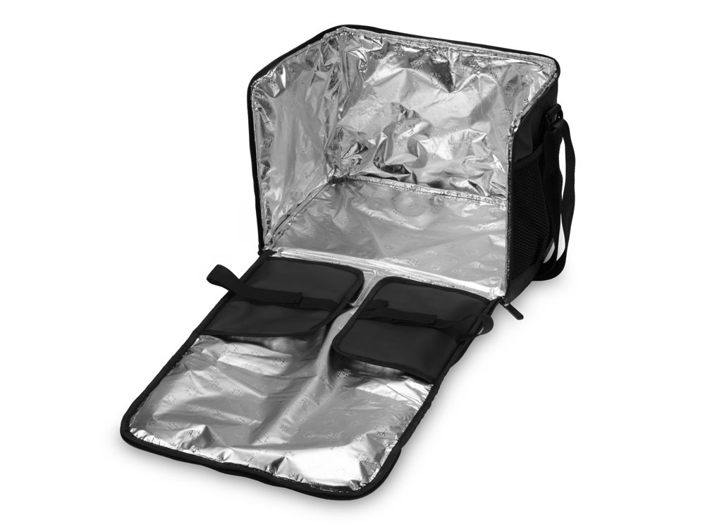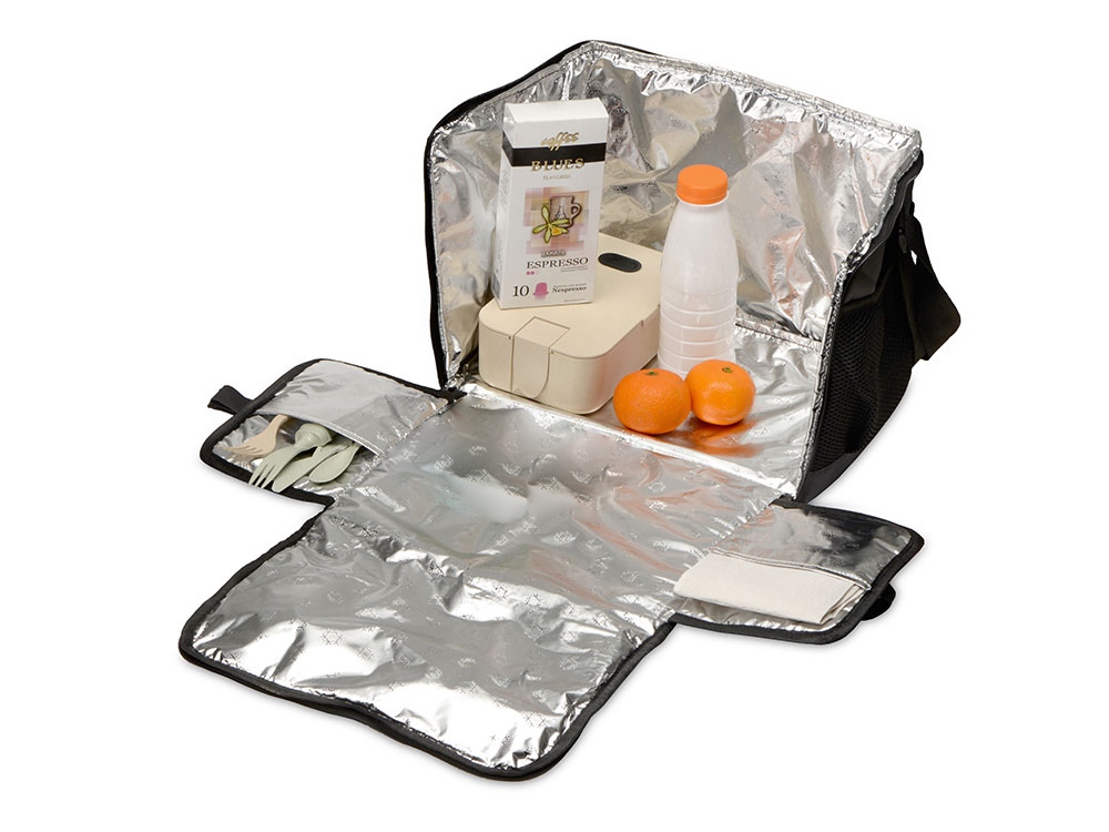 Раскладывается в удобное место для принятие пищи во время пикника на природе благодаря особой конструкции с молниями. Внутри карманы для всего необходимого и держатели на липучках для бутылок. Внутренняя подкладка из пены толщиной 3 мм. Широкая лямка регулируется по длине. 2 боковых сетчатых кармана.