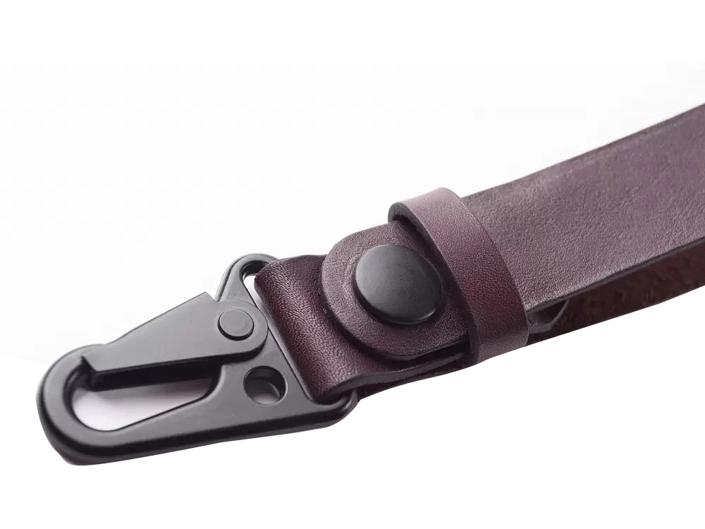 Ремешок сшит из прочной кожи коричневого цвета. Оборудован надёжным металлическим карабином, самопроизвольное расцепление которого невозможно. Ключи, прицепленные к нему, обречены вечно храниться в глубинах сумки или кармана джинсов, и у них нет ни единого шанса потеряться. Прицепить ремешок можно к шлёвке джинсов или к куртке.