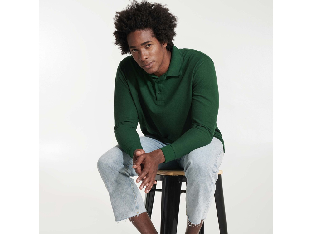 Поло с длинным рукавом. Воротник и манжеты из риба 1х1 с эластаном. Дополнительная укрепляющая строчка по горловине. Планка на 3 пуговицы и разрезы в боковых швах.