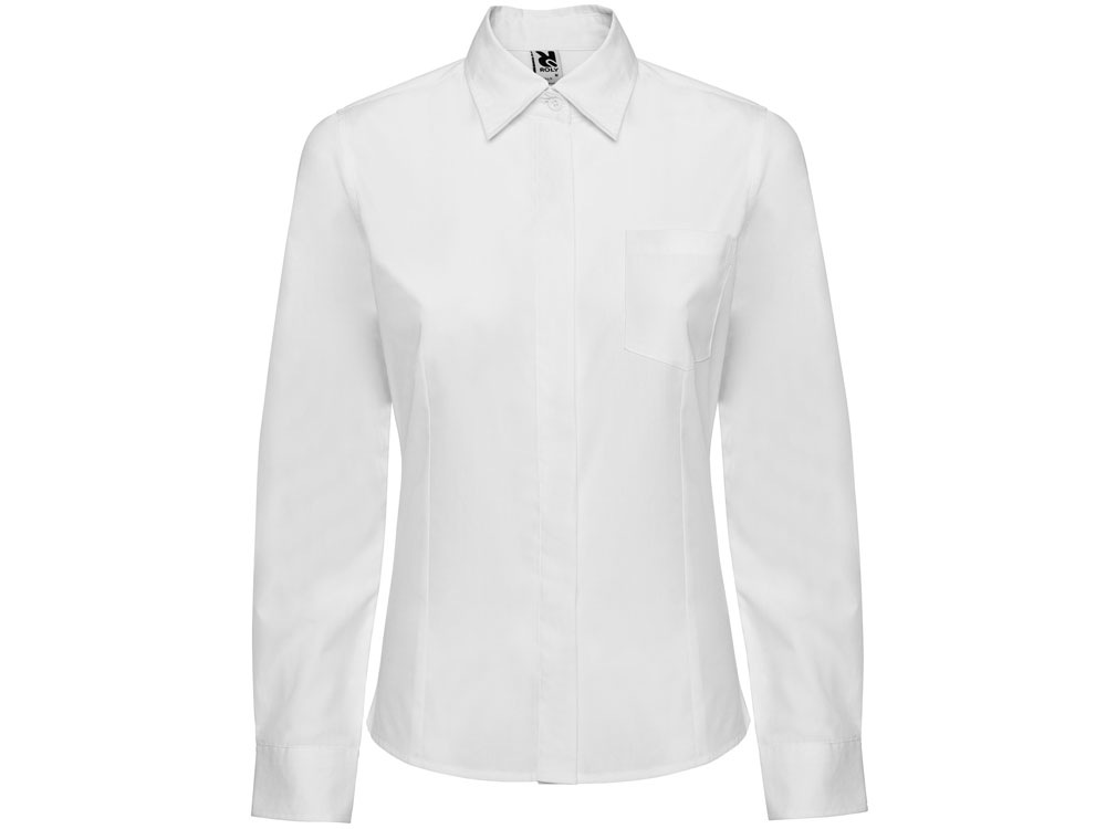 Рубашка женская прилегающего силуэта с длинным рукавом, вытачки на полочке и спинке. Накладной карман на груди слева, закругленный низ изделия. Планка с потайными пуговицами.