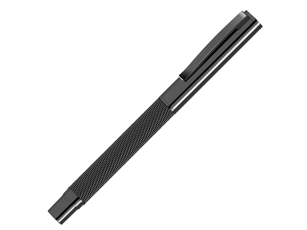 Металлический роллер, покрытый глянцевым лаком, с ремешком из настоящей сетки вокруг корпуса.