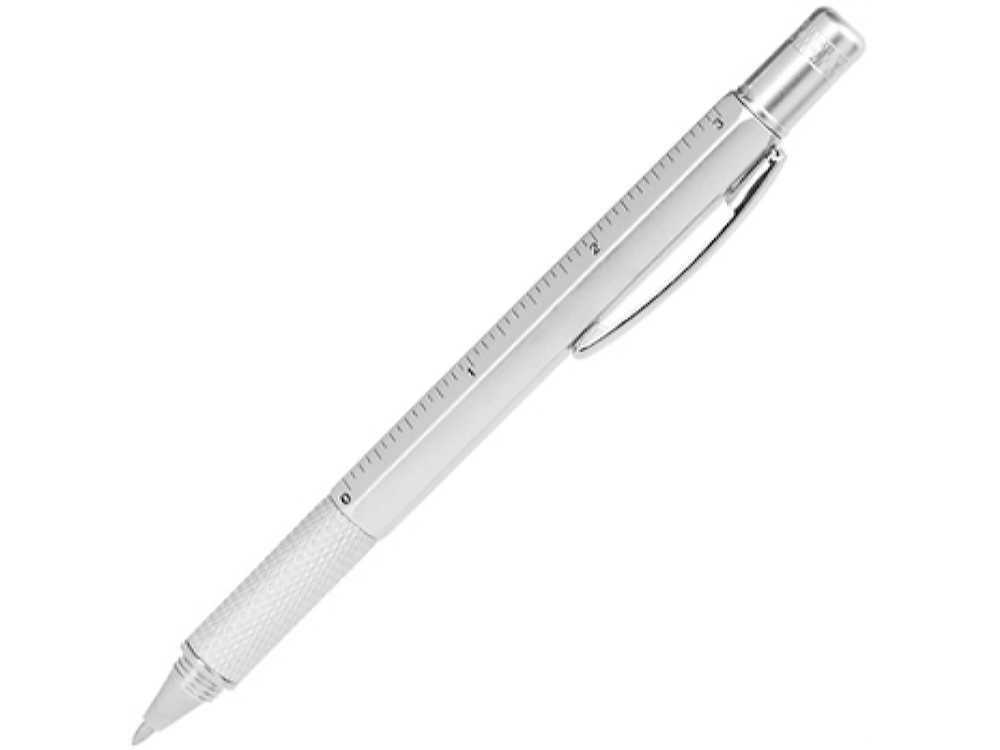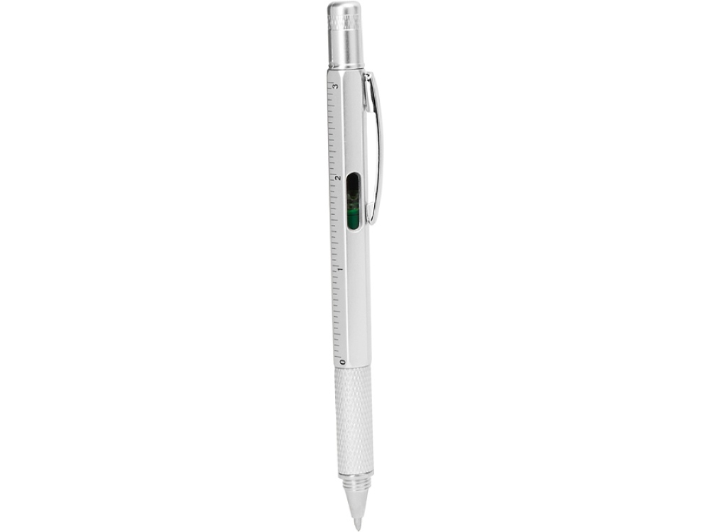 Многофункциональная ручка: уровень, сантиметровая и дюймовая линейка, плоская отвертка и звездообразная отвертка. Корпус доступен в различных цветах. Синие чернила.