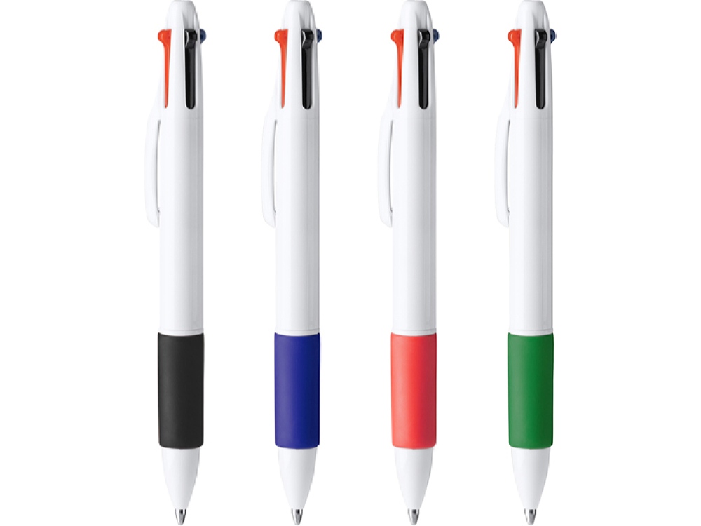 Шариковая ручка с чернилами 4-х цветов. Корпус из АБС-пластика с мягким цветным грипом. Чернила синего, черного, красного и зеленого цветов.