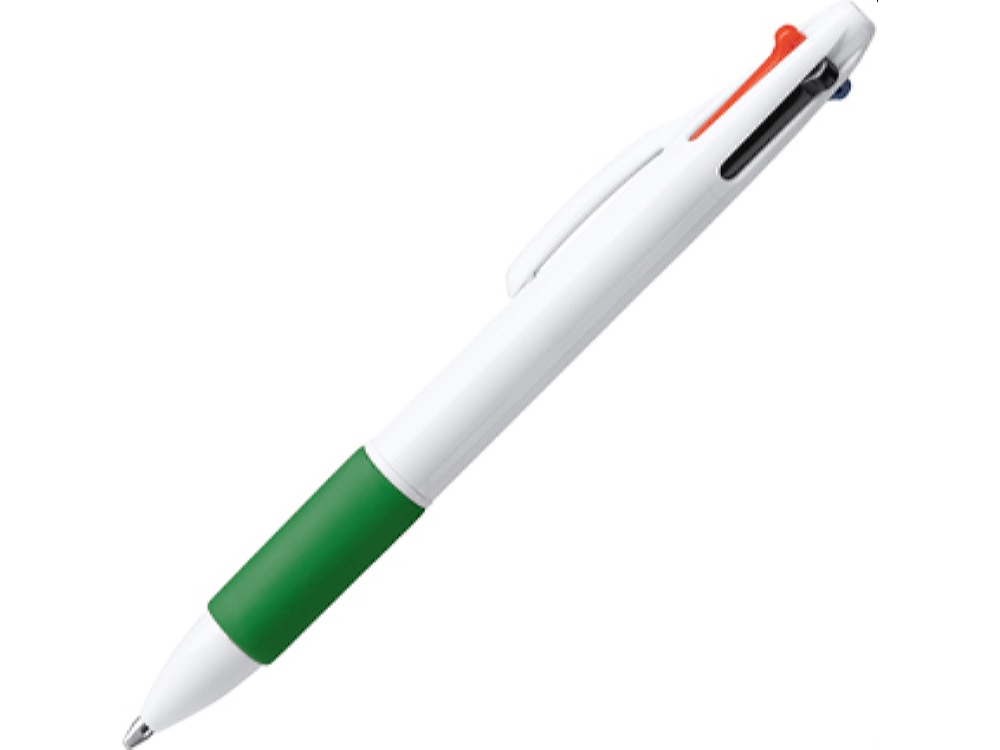 Шариковая ручка с чернилами 4-х цветов. Корпус из АБС-пластика с мягким цветным грипом. Чернила синего, черного, красного и зеленого цветов.