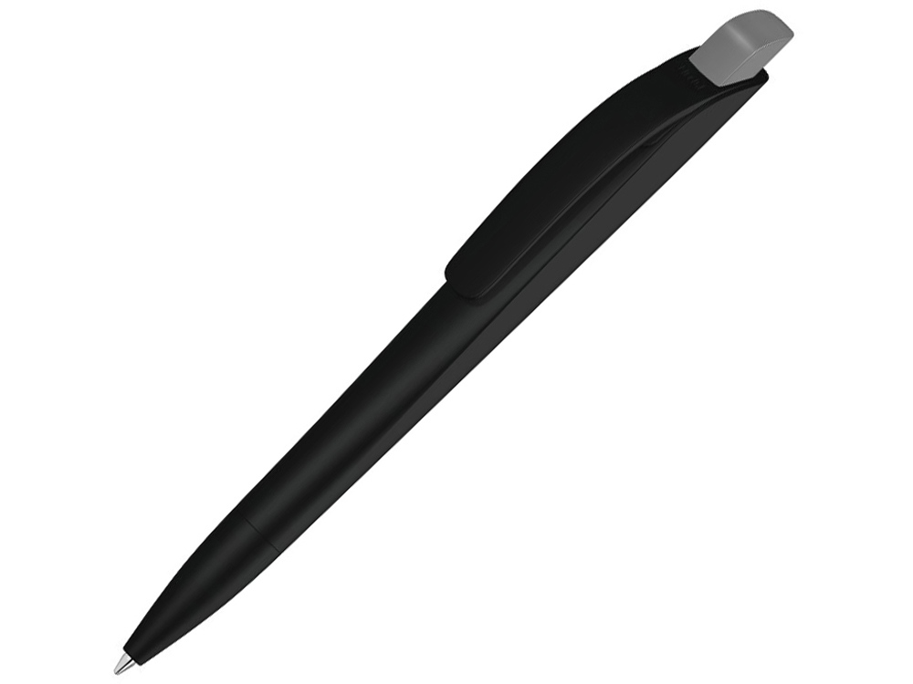Автоматическая шариковая ручка с нажимным механизмом, матовым тонированным черным корпусом и цветным наконечником, широким изогнутым клипом.