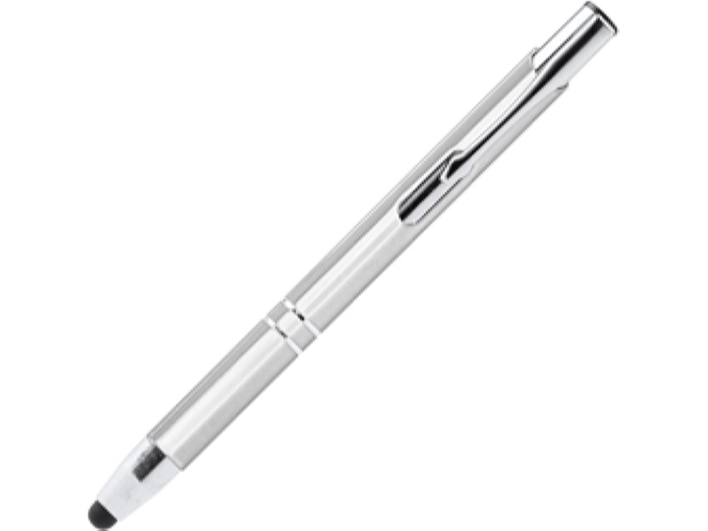 Шариковая ручка с алюминиевым корпусом и кнопкой с анодированным покрытием. Сенсорный стилус. Синие чернила.