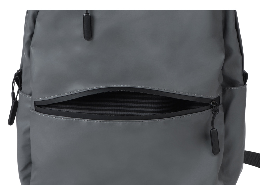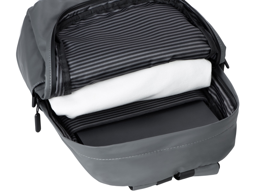 Элегантный легкий городской рюкзак из мягкого приятного на ощупь материала можно использовать для передвижений по городу, а так же в поездках, для чего на спинке предусмотрен ремень для крепления на ручку чемодана. Для удобства и компактного хранения содержимого снаружи расположены 2 передних кармана на молниях и 2 боковых кармана. Внутри уплотненный карман для ноутбука. Стильная подкладка в полоску в тон цвета внешнего материала делает рюкзак модным аксессуаром. Благодаря водостойкому материалу и молниям содержимое рюкзака не намокнет под дождем. Лямки регулируются по длине.